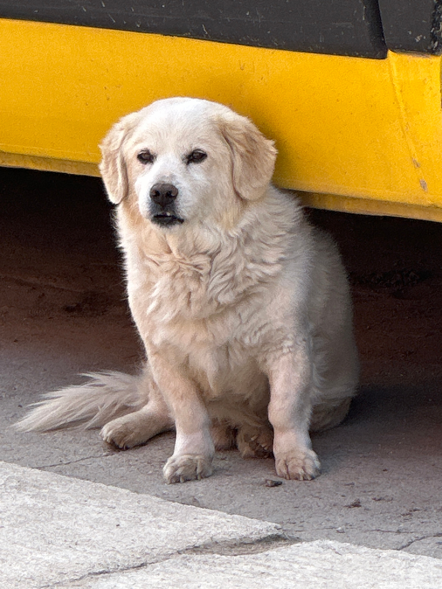 A cream-colored dog rests between a yellow support pillar and a concrete wall. The dog is looking directly at the camera, and the scene appears to be outdoors in Manole, Bulgaria.
