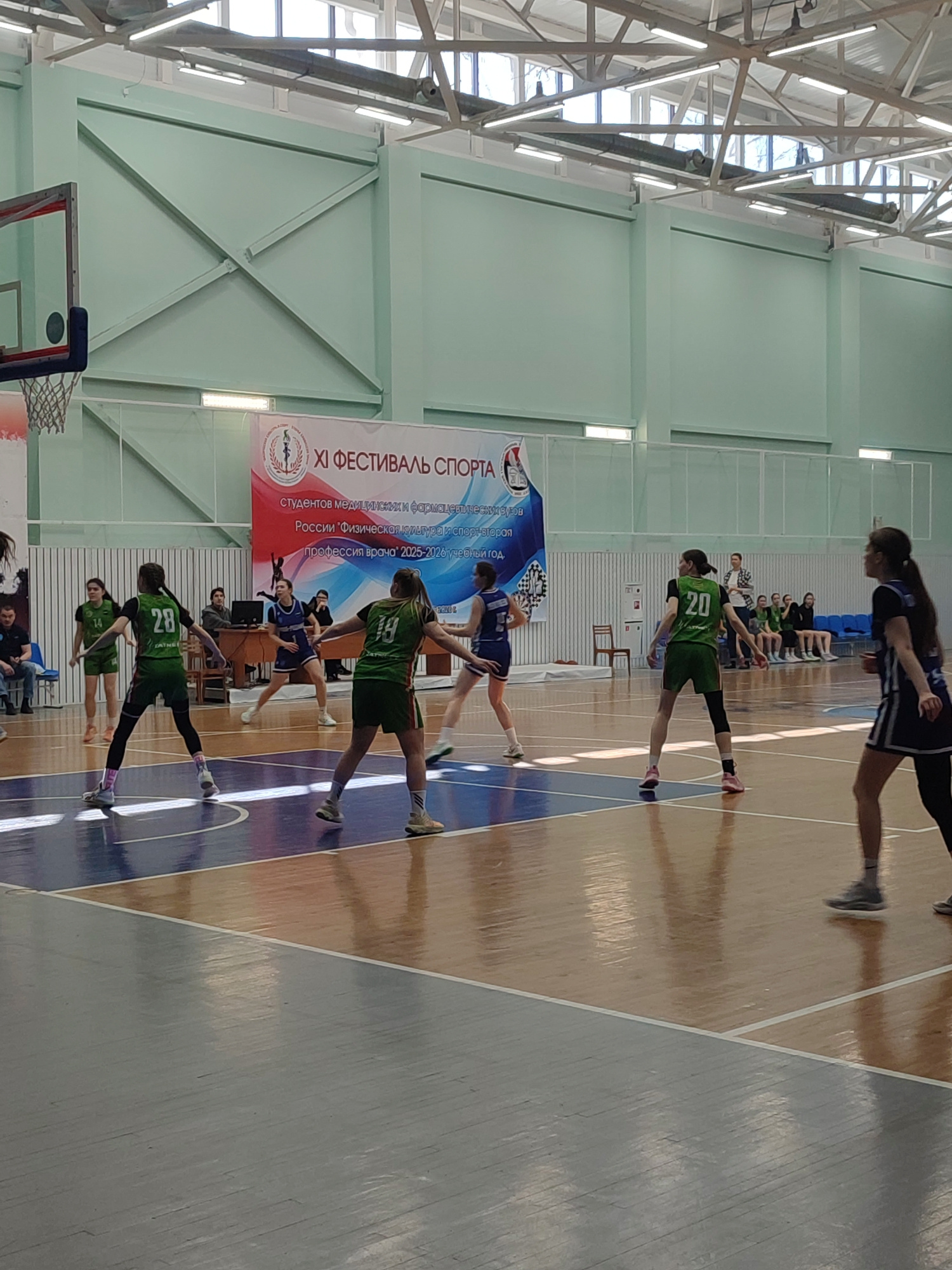 The image shows a basketball game indoors. The players are wearing uniforms with numbers. Two of the players wear green uniforms with the numbers 28 and 19 and 20, and the opposing team wears blue uni…read more