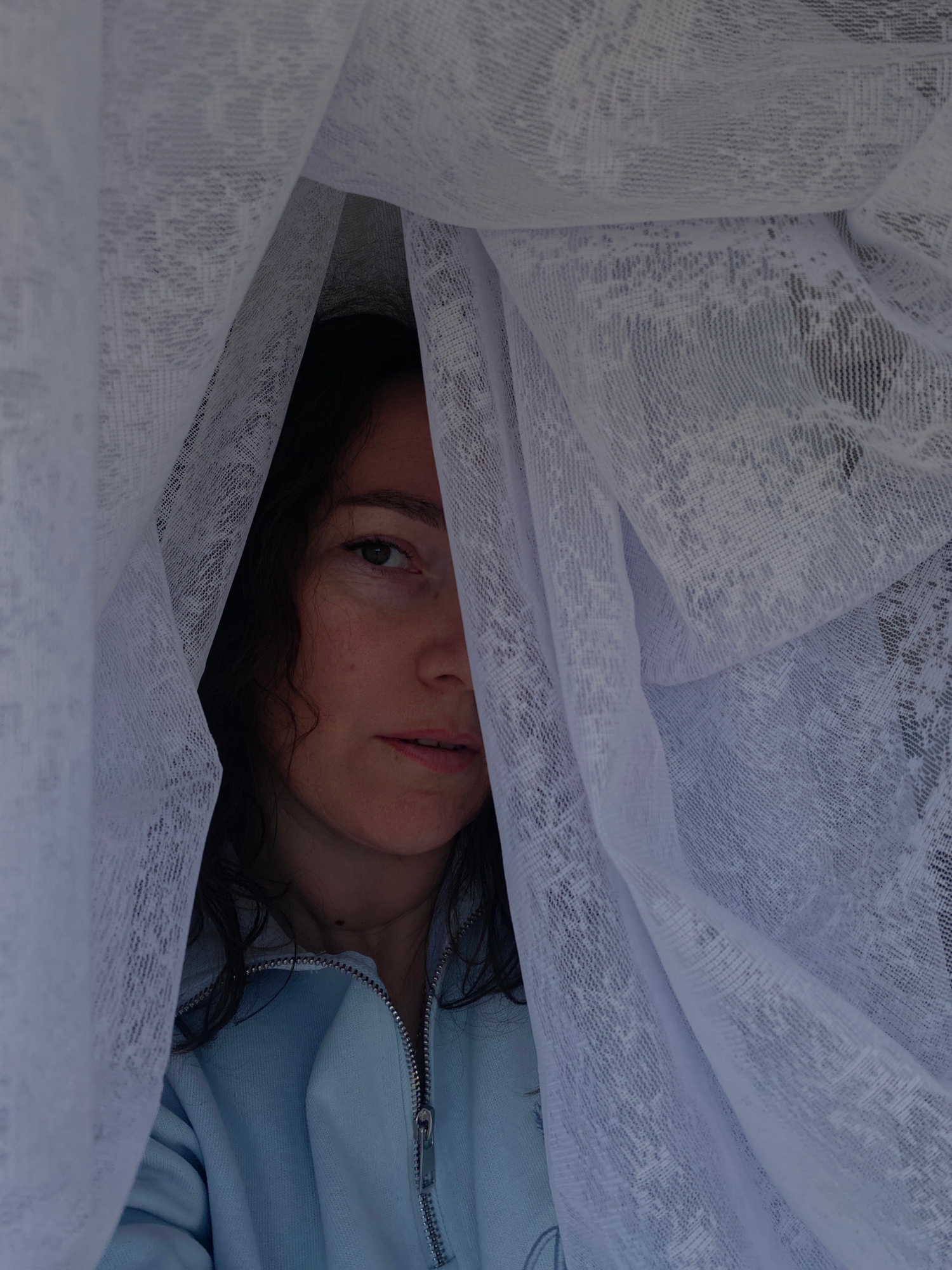 The image captures a close-up of a person's face, partially revealed from beneath folds of a light-colored, sheer fabric, likely lace or a delicate curtain. The person is positioned horizontally, with…read more