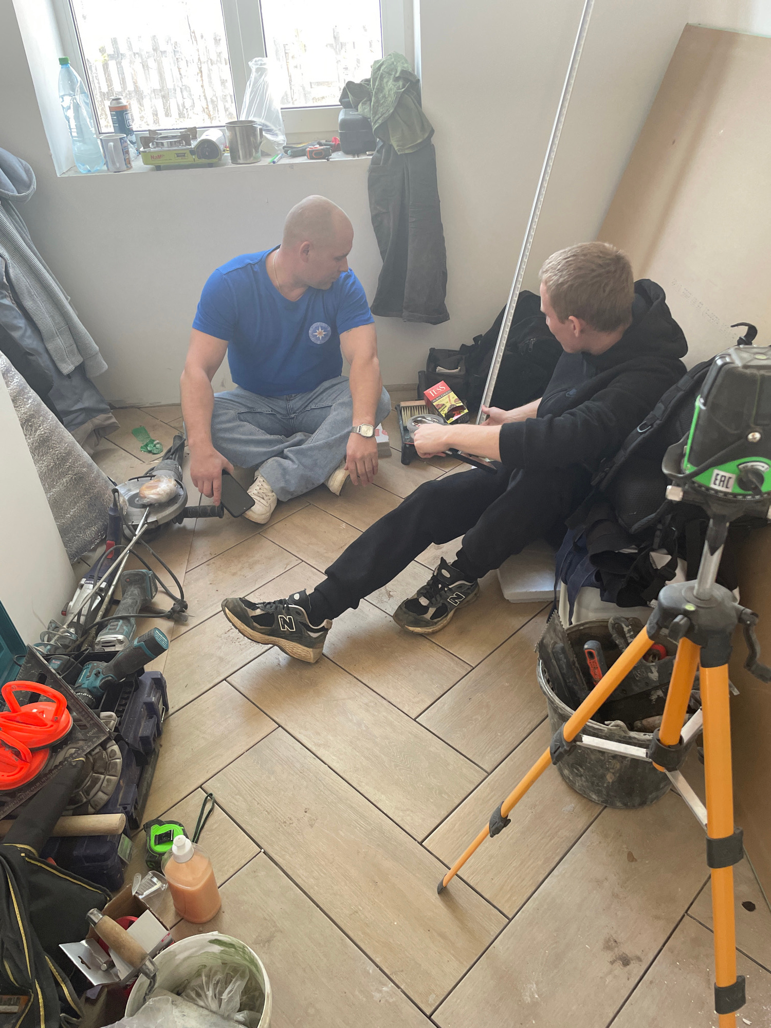 This image captures an indoor scene, likely a room undergoing renovation or construction, in Chaikovsky, Russia. The floor is covered with light-colored, wood-look ceramic tiles arranged in a herringb…read more