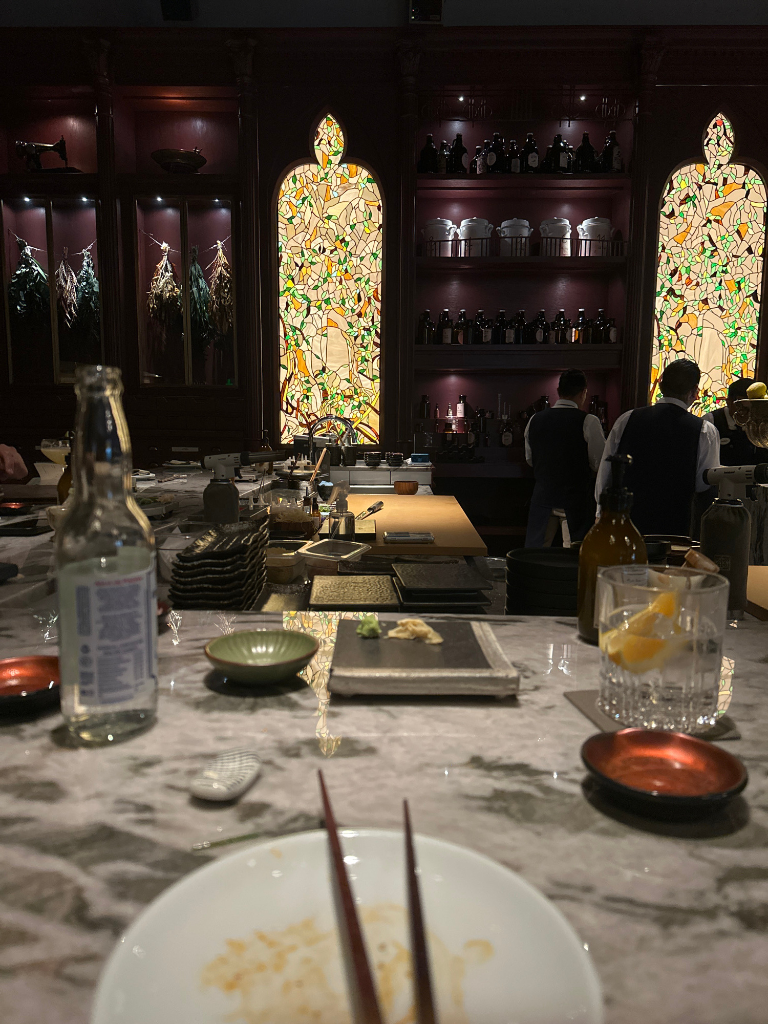 The image captures the interior of a restaurant in Mexico City, Mexico, featuring dark wood panelling, arched stained-glass windows, and shelves displaying various items. Two individuals wearing white…read more