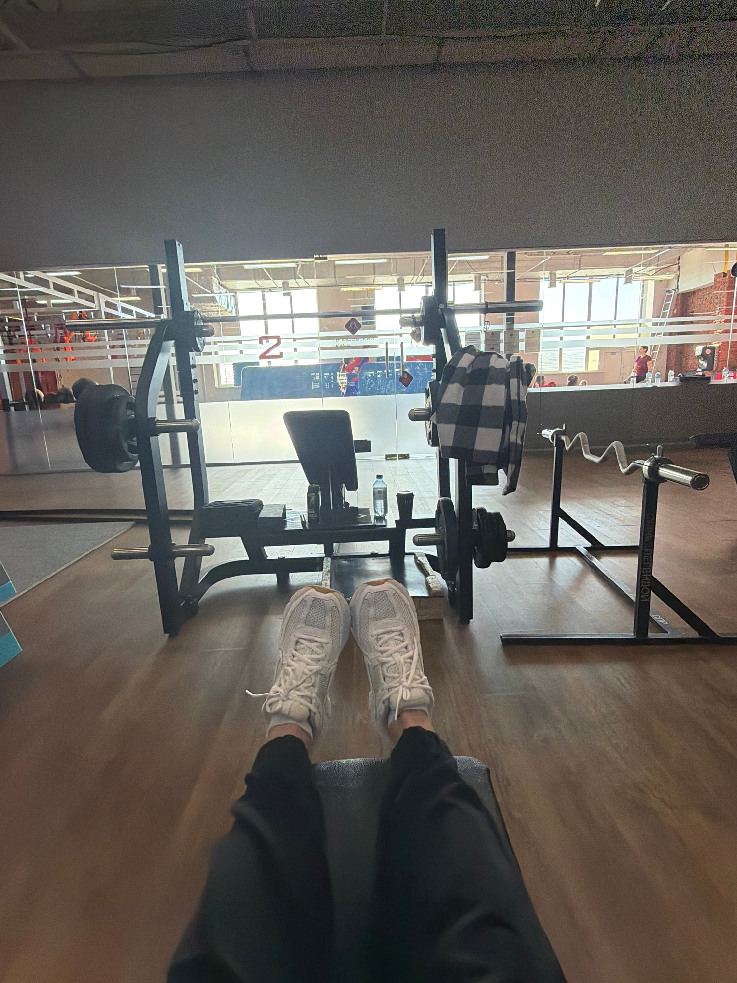 The image captures an indoor gym setting, viewed from a first-person perspective, with the photographer's legs and feet in the foreground. The person is wearing black pants and white athletic sneakers…read more