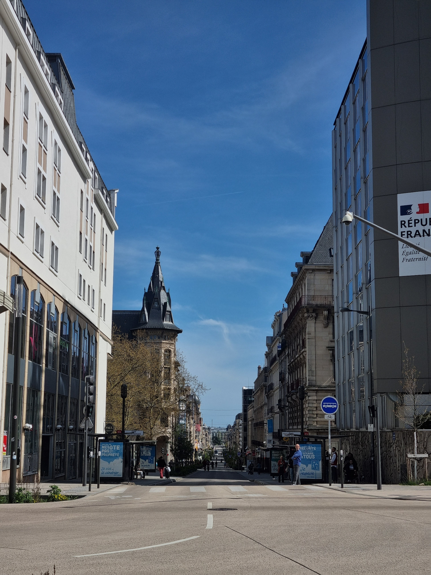 The image depicts a street view in Nancy, France, looking toward a landmark building featuring a tall, pointed spire. The scene is framed by buildings on either side, one of which displays the "Républ…read more