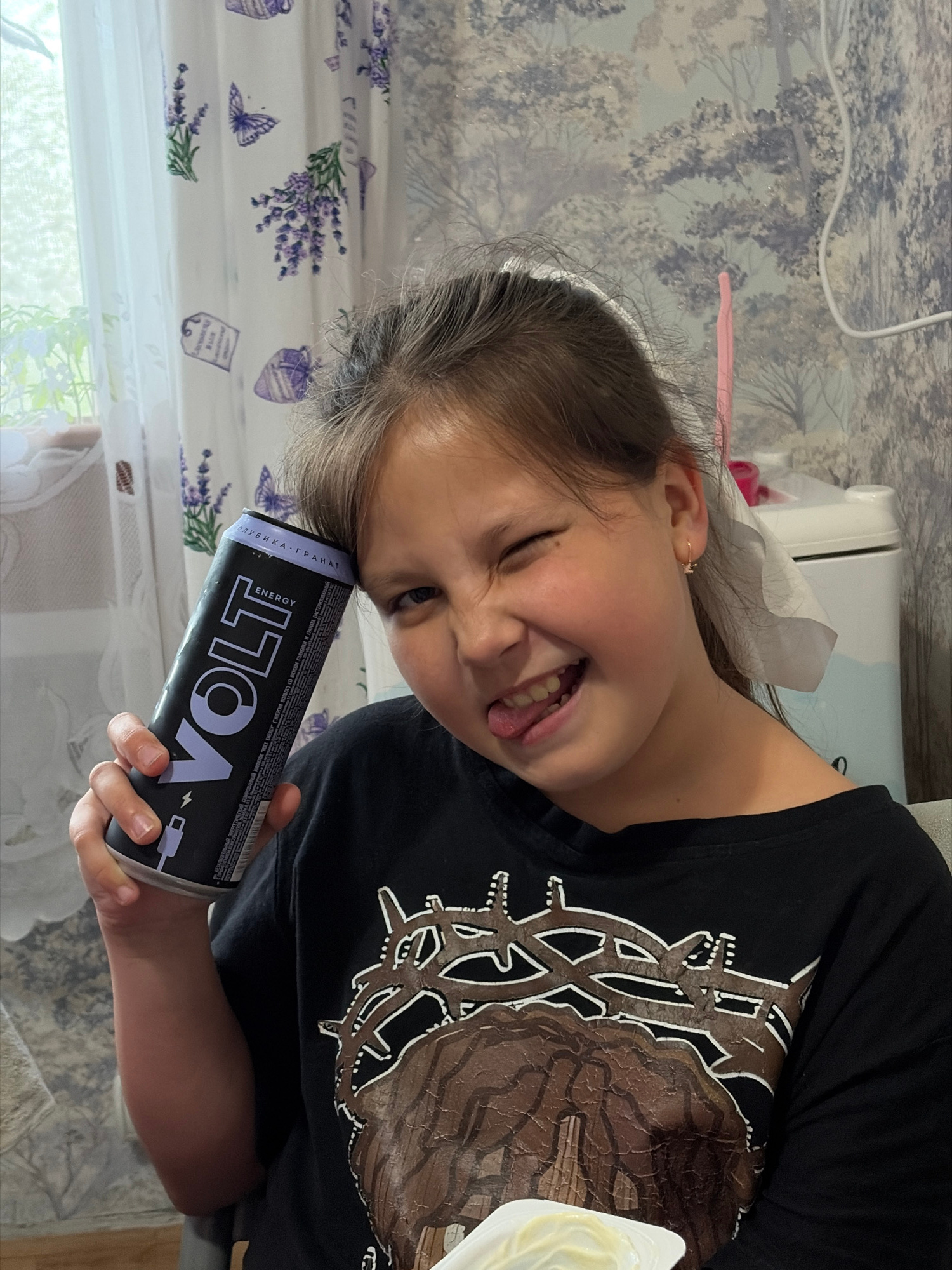 A young girl is depicted in a playful, close-up, and vertically oriented portrait taken indoors in Novopokrovskaya, Russia. She is making a mischievous expression, winking with one eye, sticking out h…read more