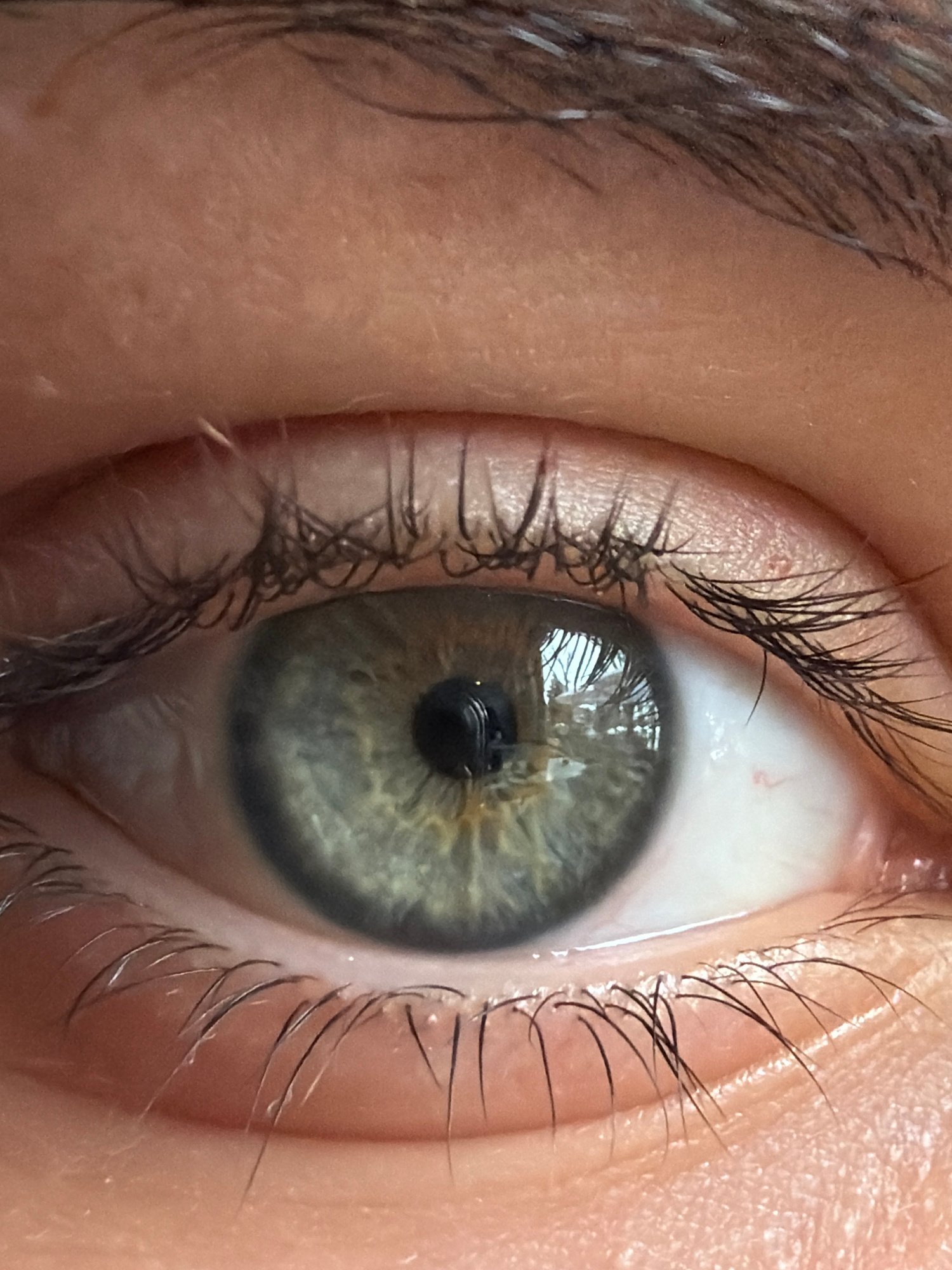 Close-up shot of a human eye with a green iris, surrounded by eyelashes and skin. The eye reflects a bright, blurred environment. No elements indicate the location as Karlovo, Bulgaria.