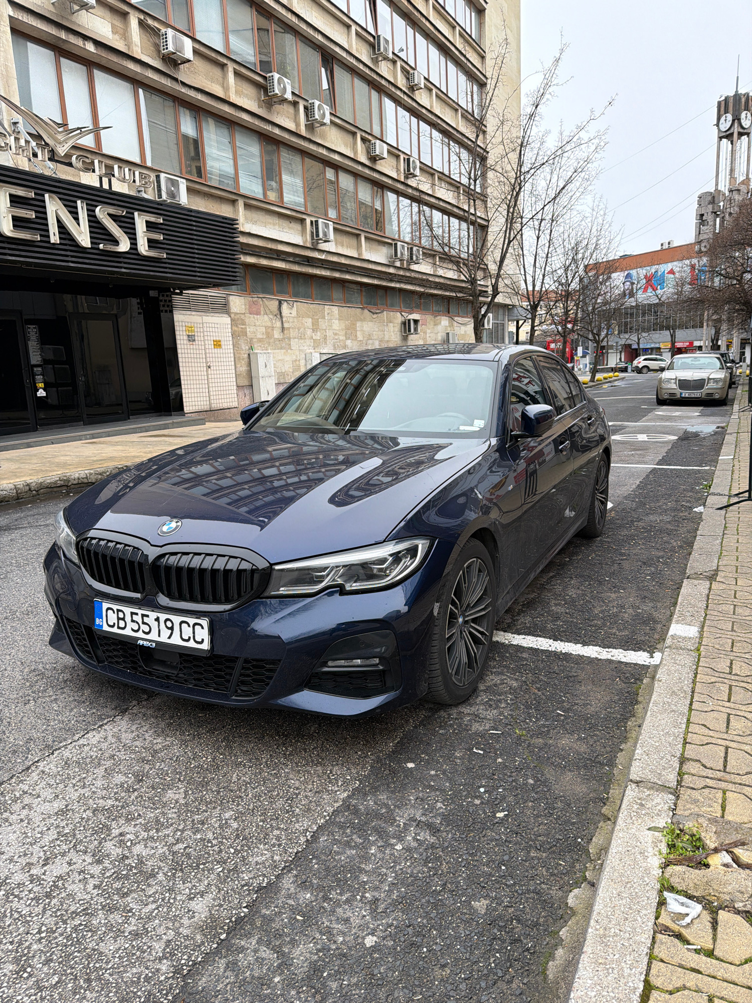 The image captures a blue BMW car parked on the side of a street in Haskovo, Bulgaria. The car, bearing a Bulgarian license plate "CB 5519 CC," is positioned close to a building with multiple windows…read more