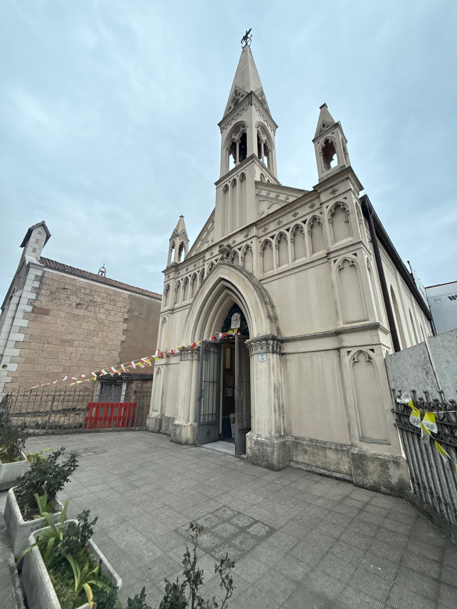 The image captures the facade of a building, possibly a church, in Sanremo, Italy. The architectural style appears to be Gothic Revival, evidenced by the pointed arches, ornate detailing, and a tall,…read more