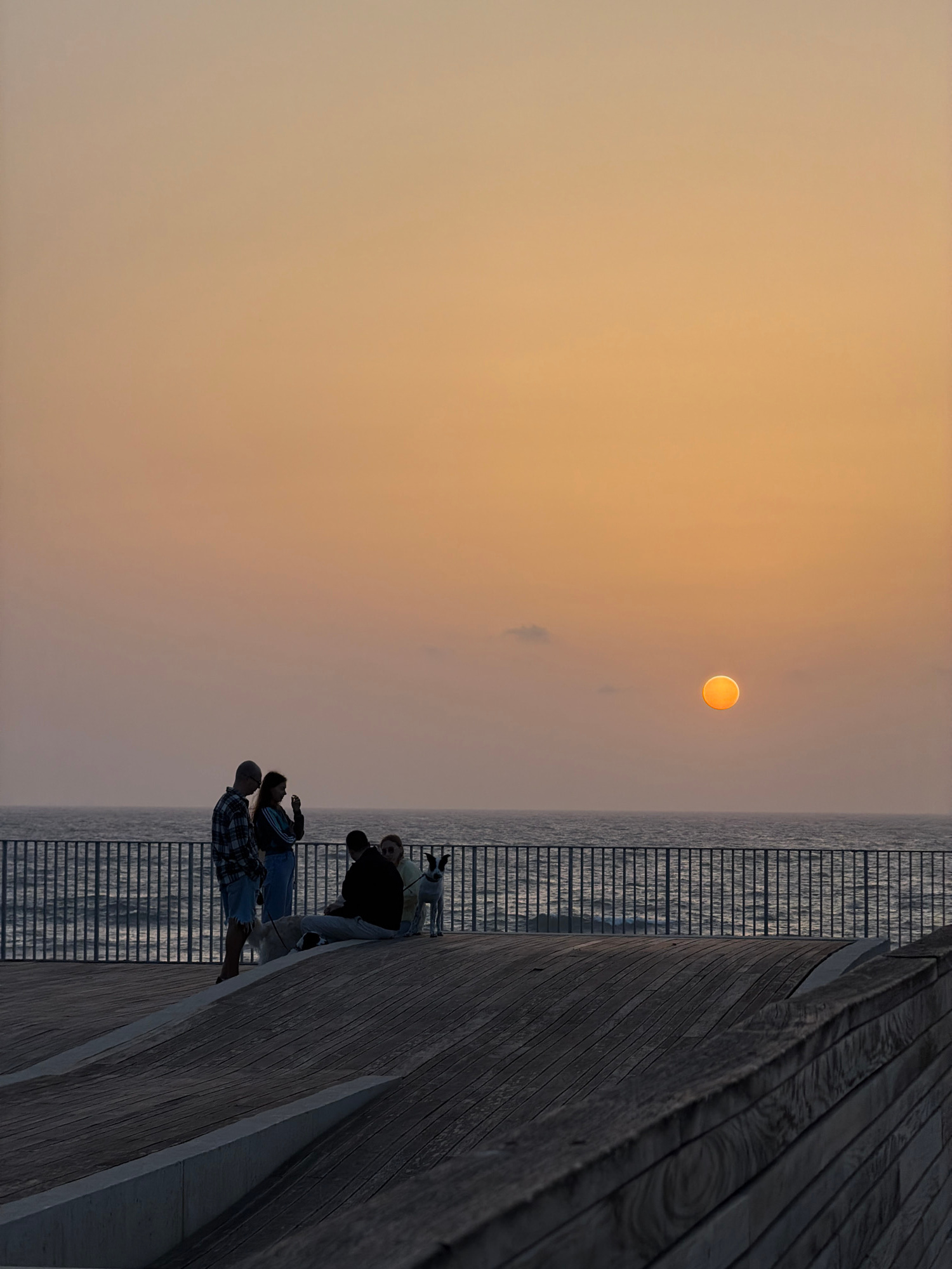 The image displays a tranquil sunset scene over a body of water, likely the Mediterranean Sea, from a modern wooden promenade or pier in Tel Aviv, Israel. The sky, bathed in the soft, warm light of du…read more