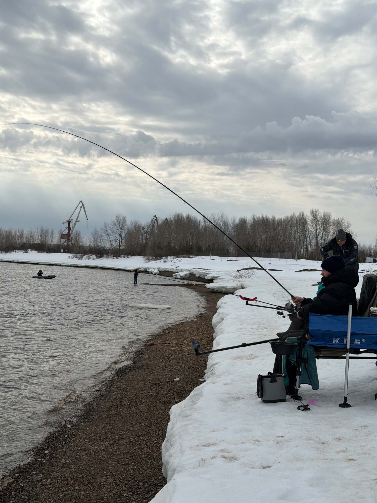 The image shows two individuals fishing in Noviy Urengoy, Russia. They are positioned on a snowy bank alongside a body of water. One person is actively fishing, holding a long, curved fishing rod. Inβ¦read more