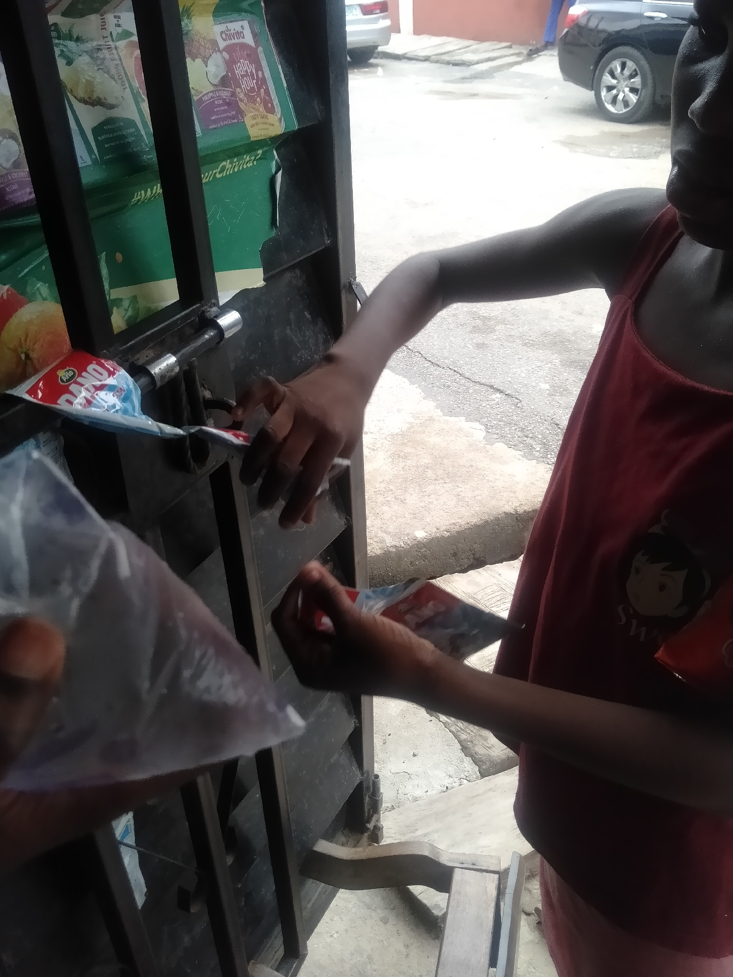This image captures a street vendor transaction in an outdoor setting, likely in Shangisha, Nigeria. **Subjects:** A person, possibly a youth, is visible on the right side of the frame, wearing a dar…read more