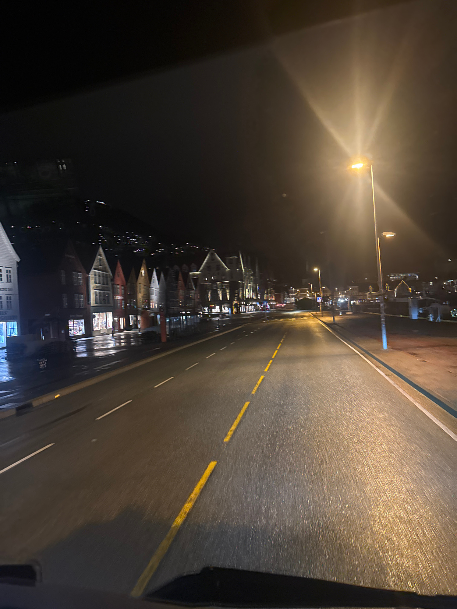 The image depicts a street scene in Bergen, Norway, at night. The view is along a road, with the waterfront and buildings of Bryggen visible to the left. Streetlights illuminate the road, which has bo…read more