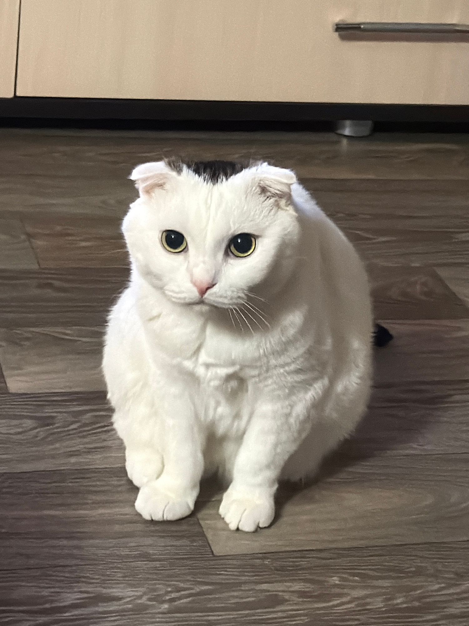 A white cat with yellow eyes is lying on a grey wood-patterned floor. Its head is turned to face the camera. The edge of a cabinet is visible on the left side of the image. The scene is indoors.