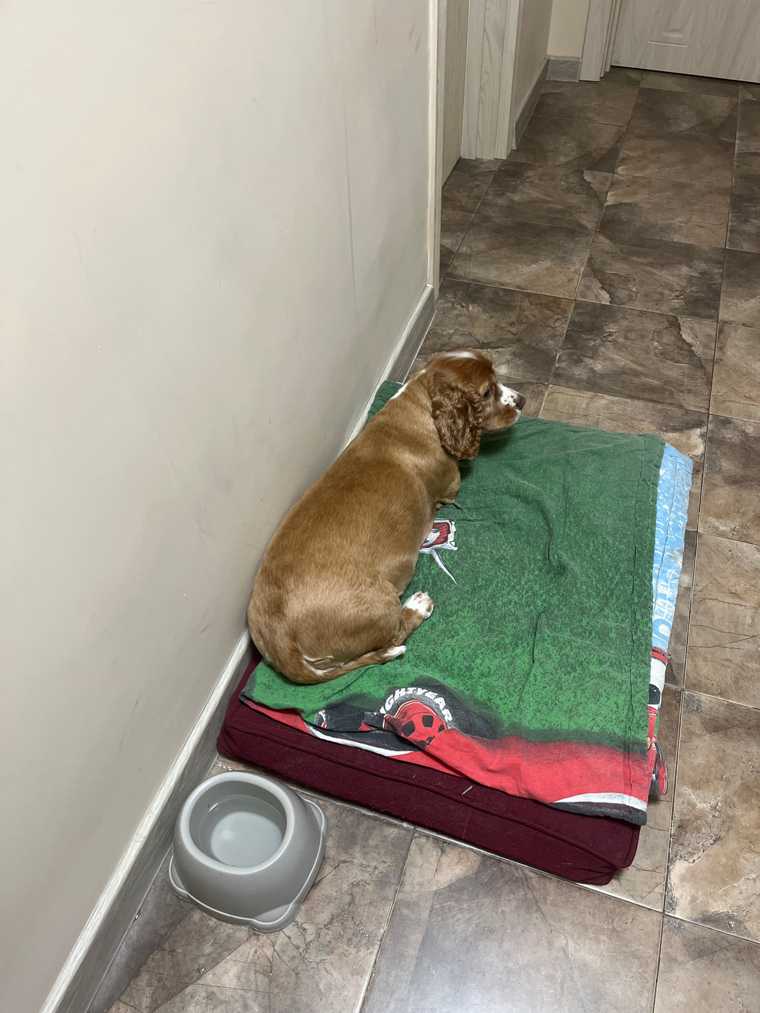 A tan and white dog is lying on a stack of blankets. The top blanket is green, red, and white, and the bottom blanket is blue. A gray dog bowl filled with water is sitting next to the blankets. The do…read more