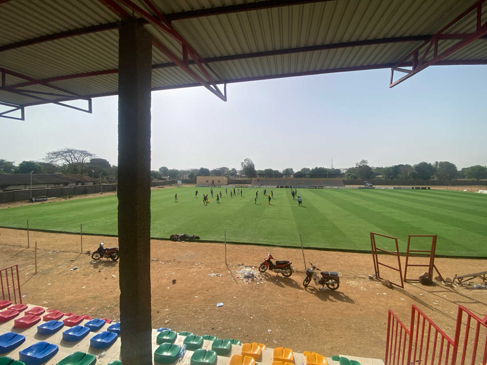 The image shows a view of a soccer field and its surrounding area from a partially covered stadium. The field is green with striped mowing patterns, and a group of people are practicing on it. The sta…read more