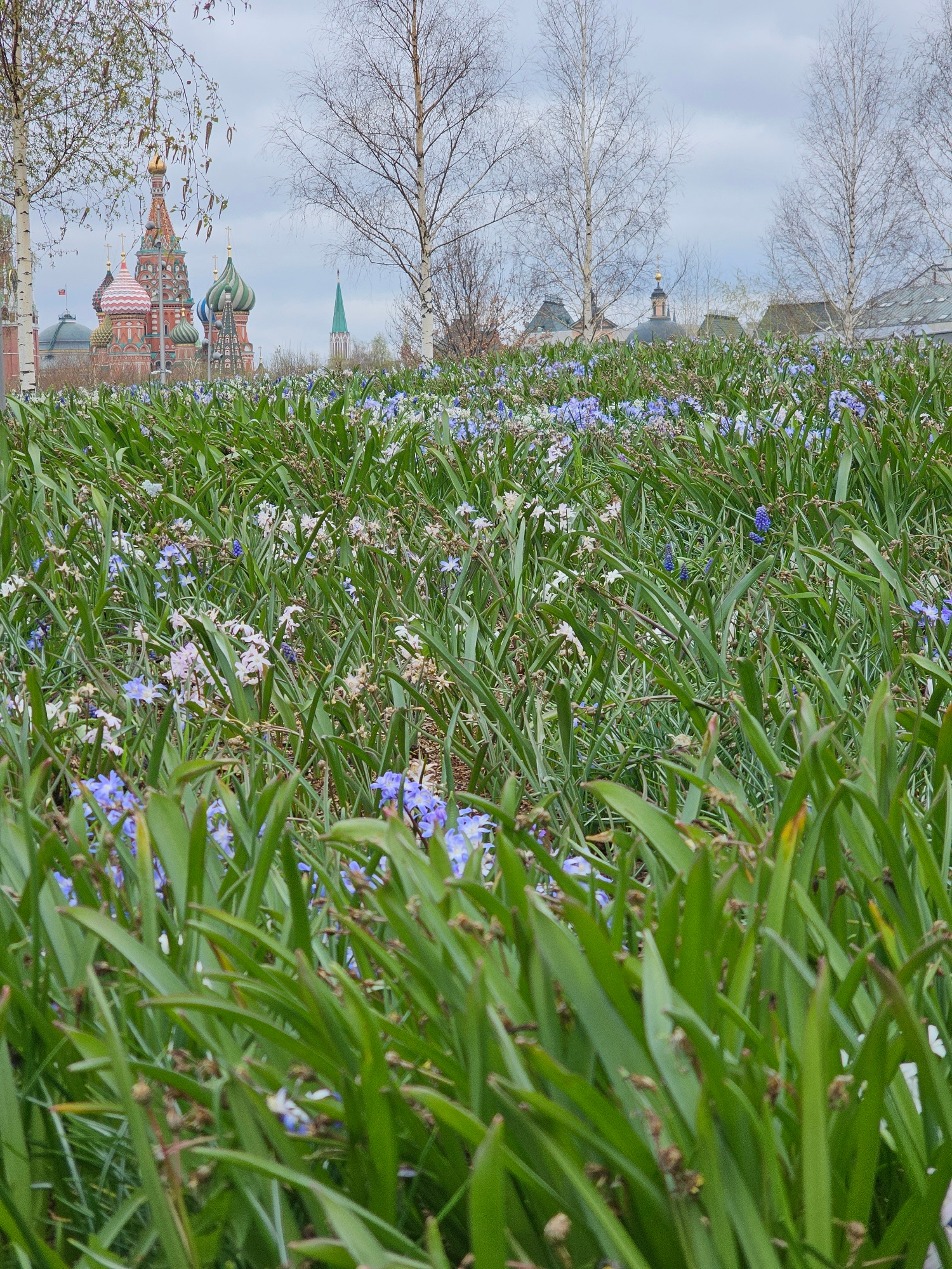 The image captures a view of St. Basil's Cathedral in Moscow, Russia, as seen from a ground-level perspective through a field of green plants with small blue and white flowers. The iconic colorful dom…read more