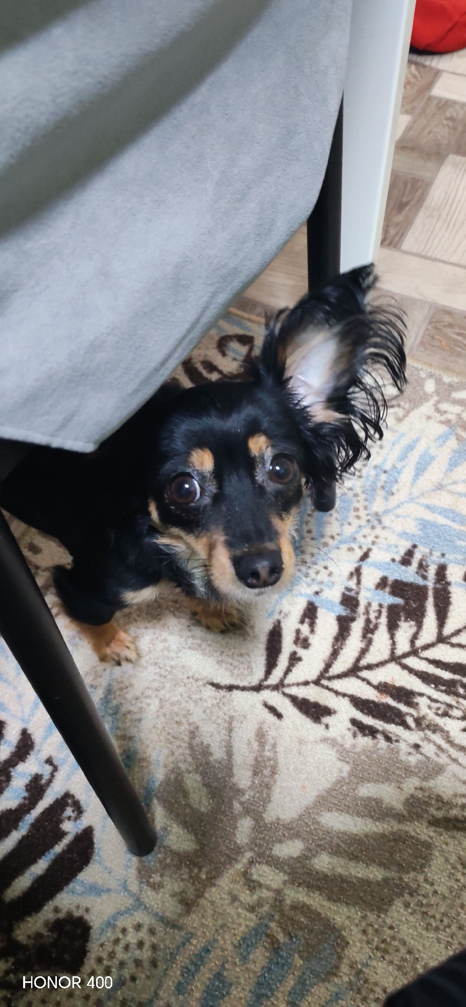 An indoor scene, situated in the city of Noviy, Russia, depicts a small, long-haired black and tan dog, consistent with a Russian Toy Terrier, partially concealed beneath a light grey textile material…read more