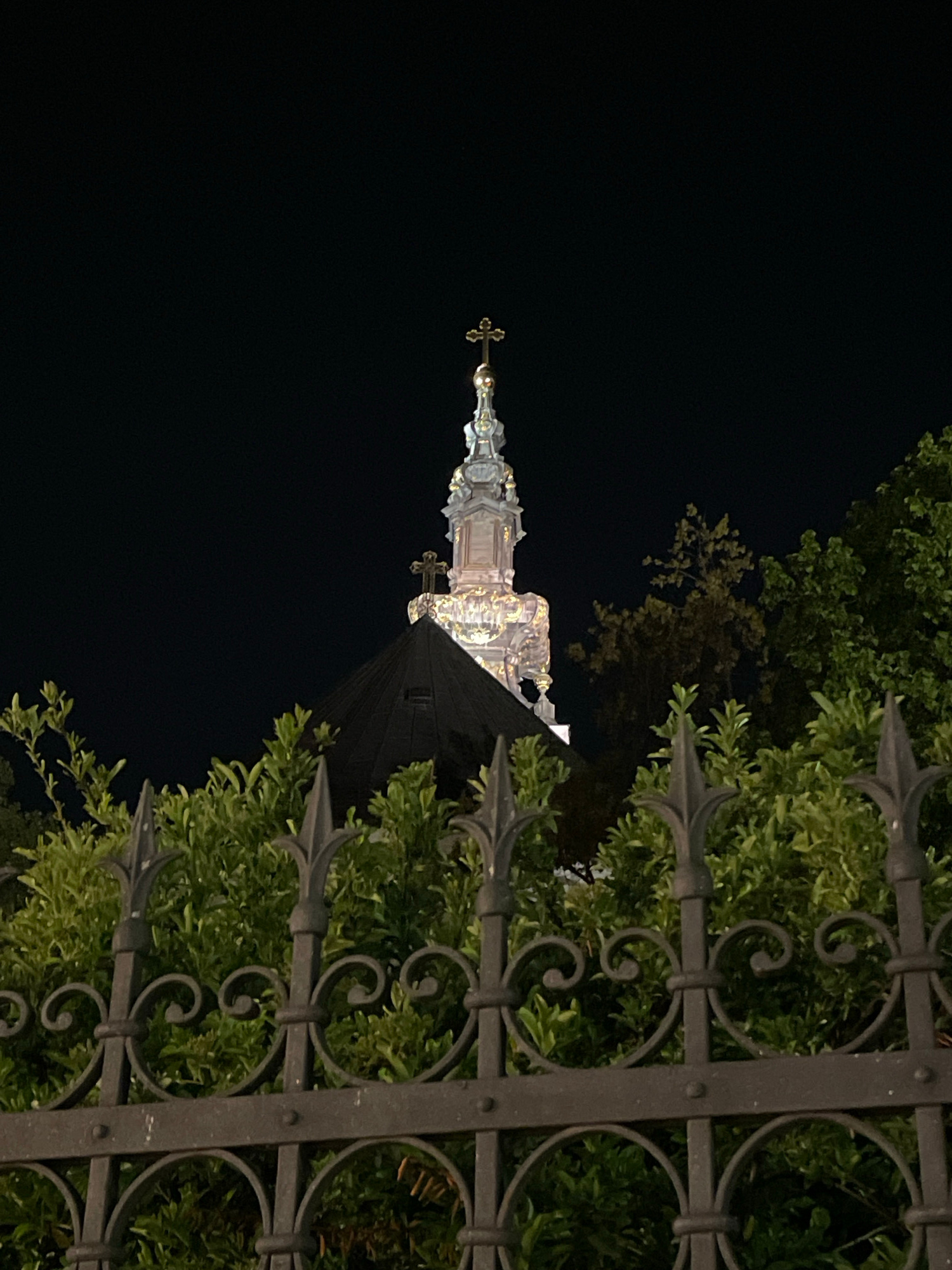 A low-angle night shot shows the ornate spire of the Name of Mary Church in Novi Sad, Serbia. The spire is illuminated and towers into a dark sky. Parts of a dark, wrought-iron fence and green foliage…read more