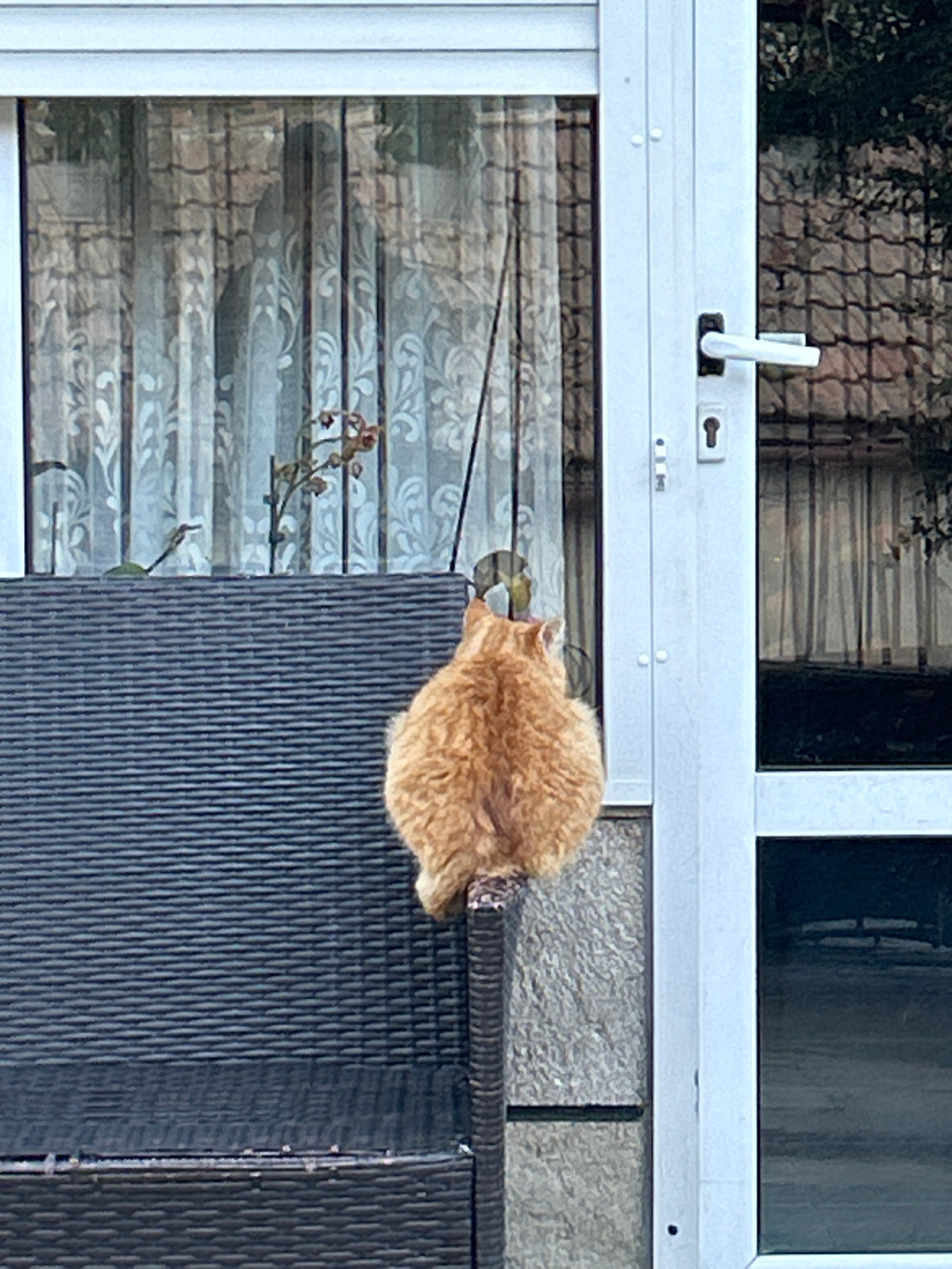 A medium shot depicts an orange cat perched on the edge of a dark, woven outdoor chair. The chair sits directly in front of a white-framed window. The window has a patterned curtain partially drawn, r…read more