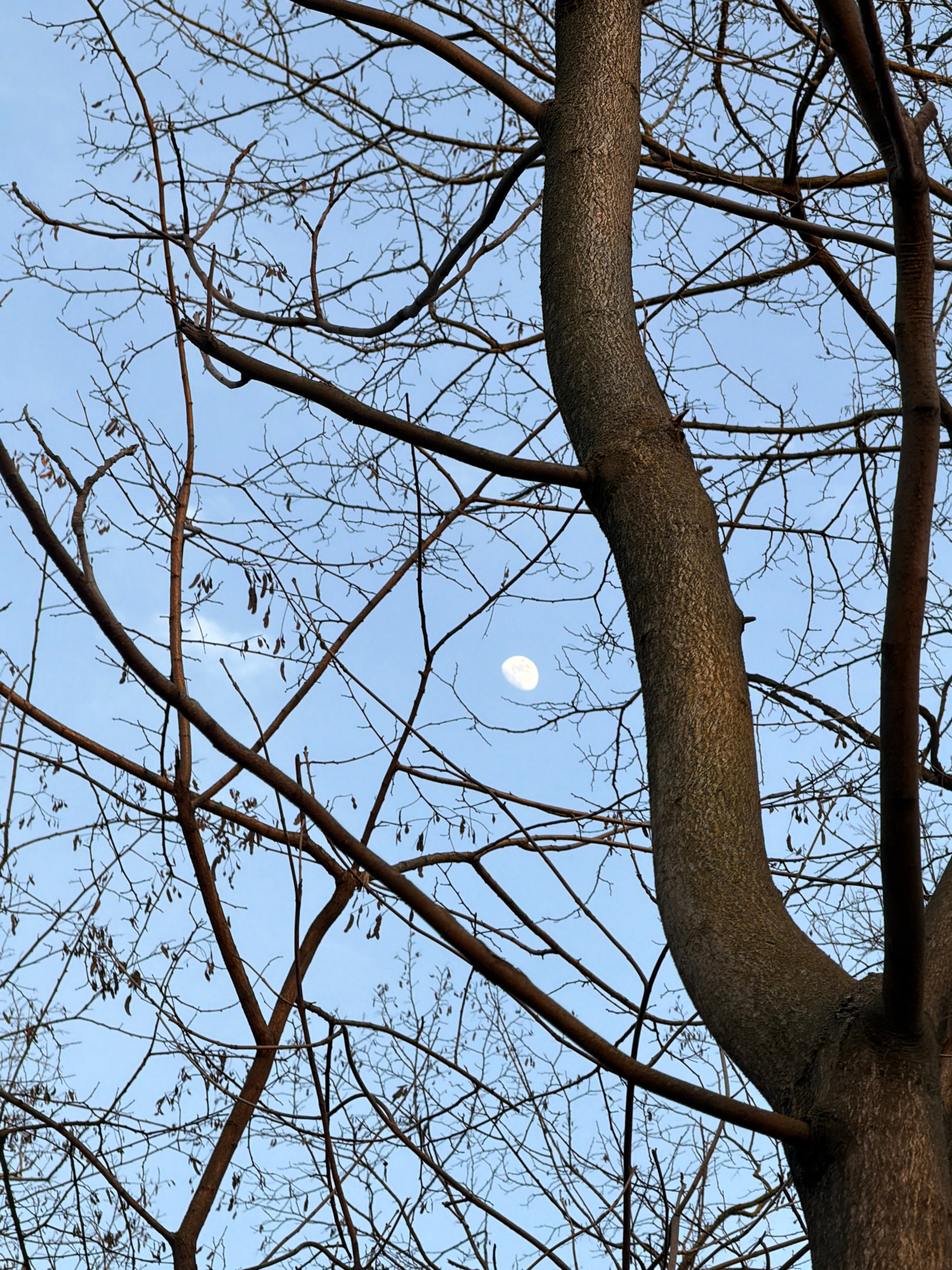 The image captures an upward view of the sky through the bare branches of deciduous trees in Rostov-on-Don, Russia. The sky is a clear, light blue with minimal, faint white cloud formations. A distinc…read more