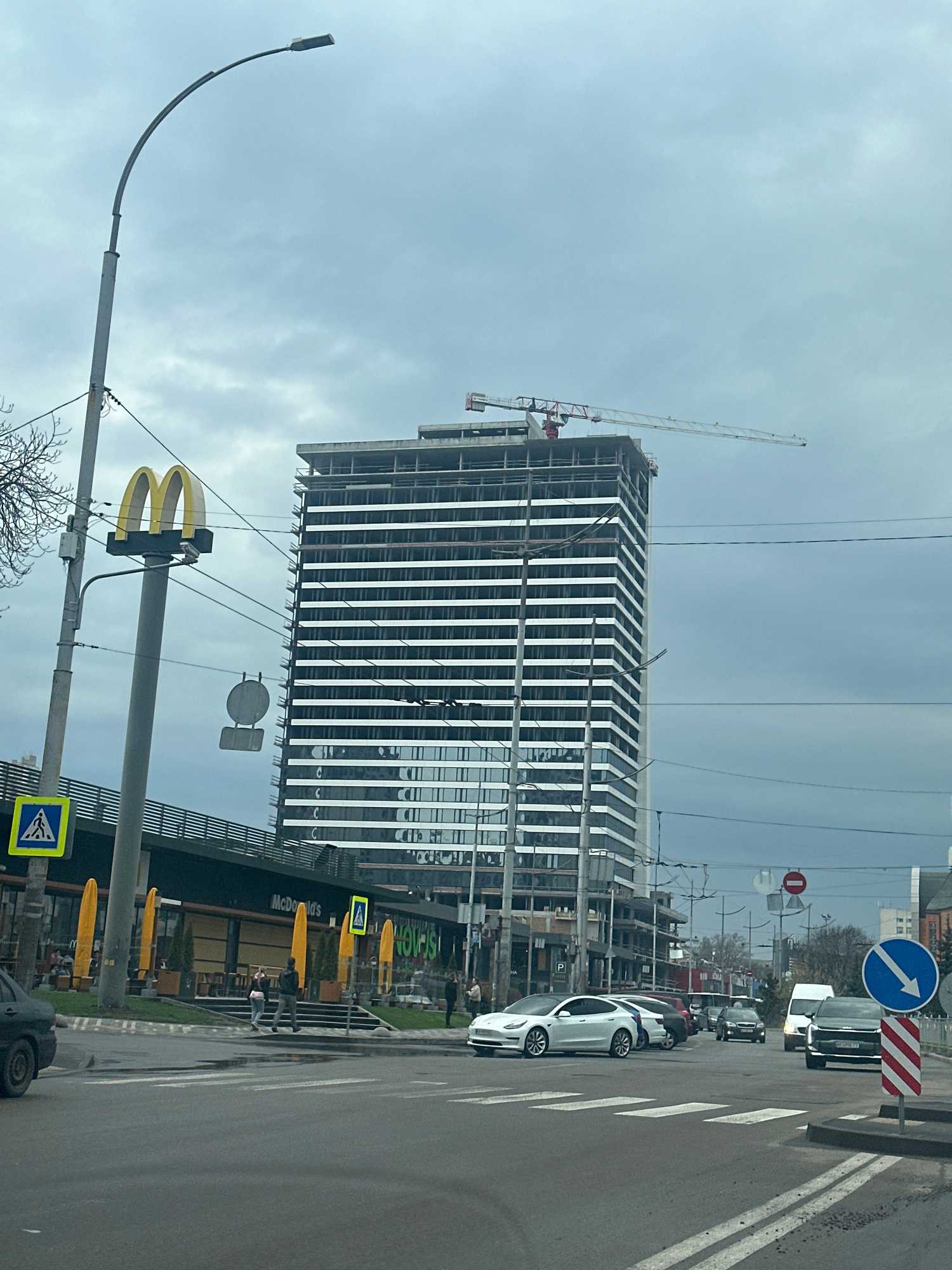 The image shows a street scene in Kyiv, Ukraine. A high-rise building under construction dominates the view, with a crane attached to the top. Adjacent to the building is a McDonald's restaurant, indi…read more