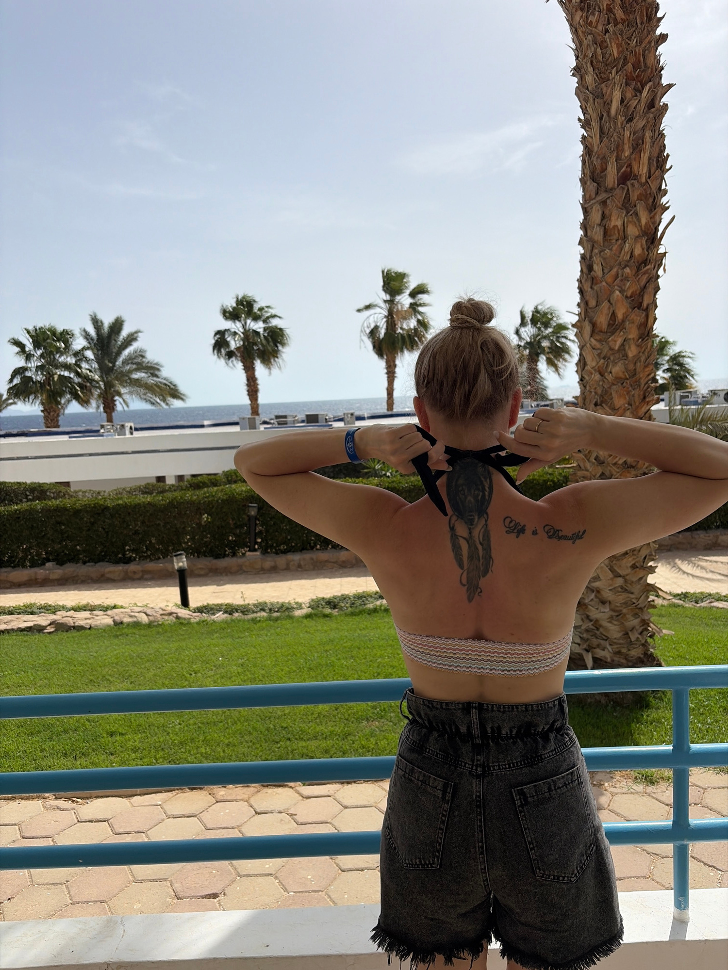 A medium, horizontally-oriented shot depicts a woman from behind with her back tattoos in view. She is on a balcony with blue railings, with grass and palm trees visible in the background. The sky is…read more