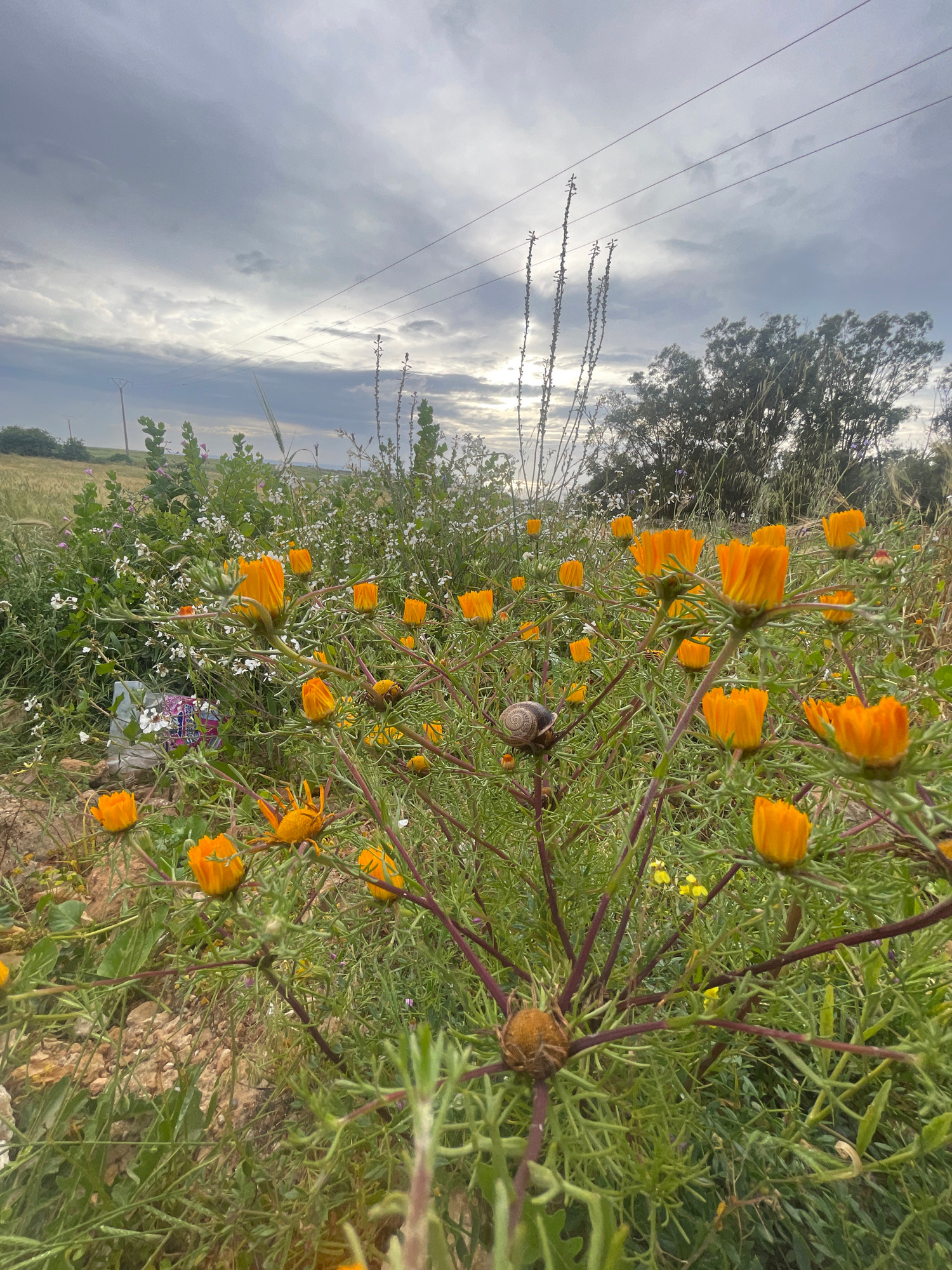 The scene is a field of wildflowers in Ahrara, Morocco. Predominantly, the field is covered with orange flowers with dark green stems and leaves. There is a snail visible on one of the stems. In the b…read more