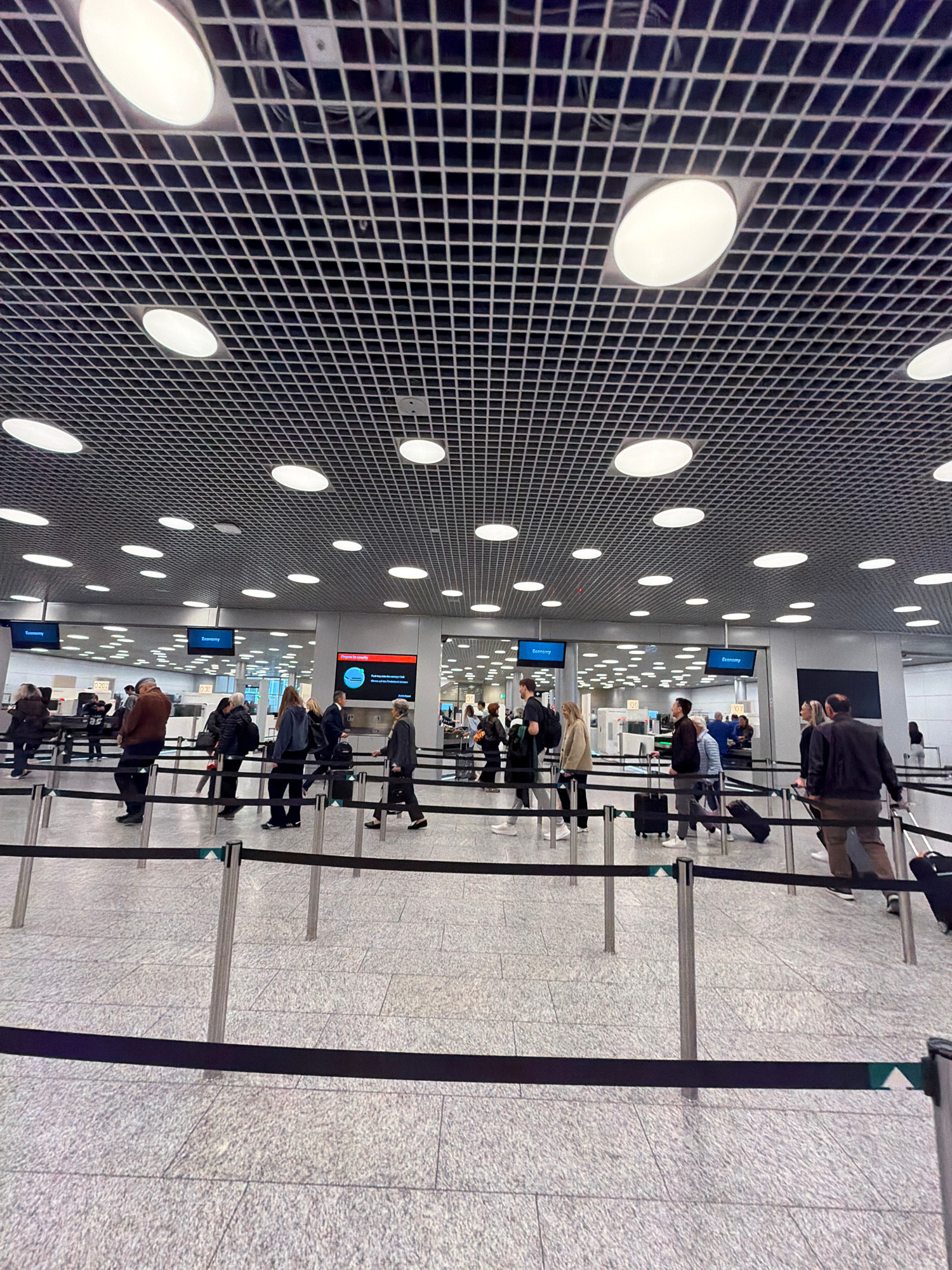 This image captures an indoor scene at what appears to be an airport in Kloten, Switzerland, likely a check-in or security area. The perspective is from the side, looking down a series of queues. The…read more