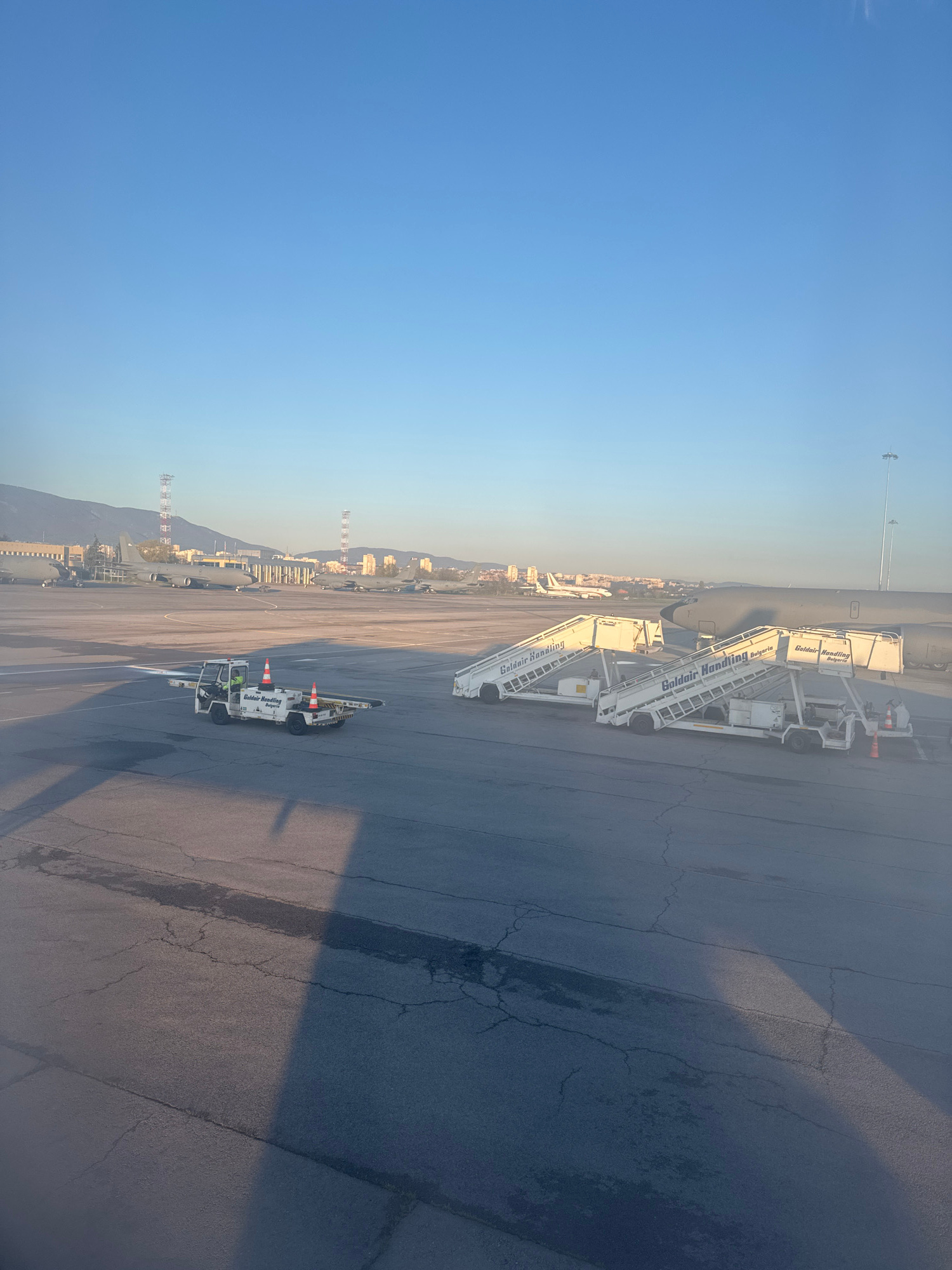 The image depicts an airport scene under a clear blue sky. Several sets of mobile passenger stairs, labeled "Goldair Handling Bulgaria," are parked on the tarmac. A small service vehicle, also labeledβ¦read more