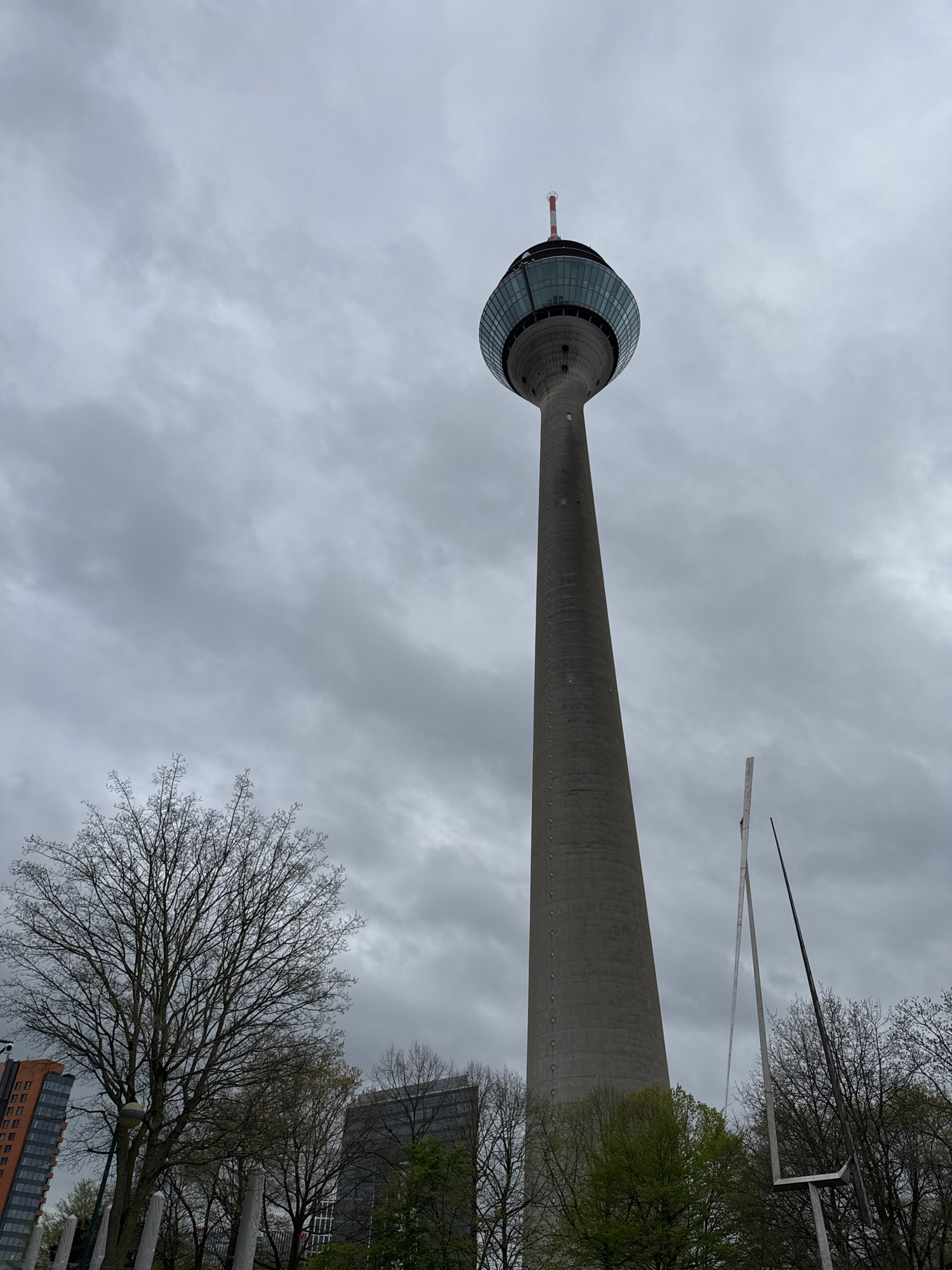The image shows a low-angle view of the Rheinturm, a television tower in Düsseldorf, Germany. The tower has a cylindrical concrete shaft topped with a glass-enclosed observation deck. An antenna is vi…read more