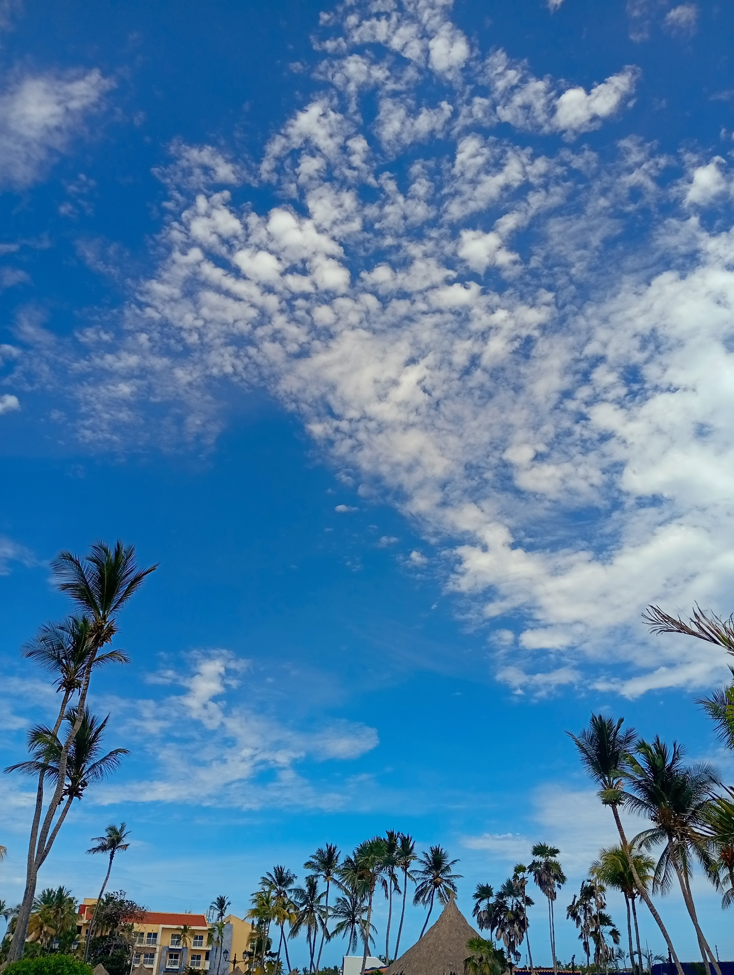 The image shows a view of Playa El Agua, Venezuela. The sky is blue and filled with cumulus clouds. Palm trees are visible in the foreground, and a building with yellow walls and a red roof can be see…read more