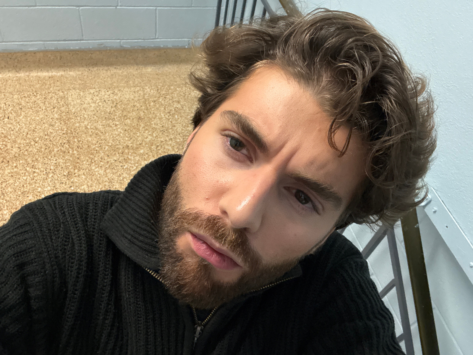 The image is a selfie taken by a light-skinned male with brown hair and a beard, wearing a black zippered sweater. The camera is positioned at an angle looking up at the subject's face. The background…read more
