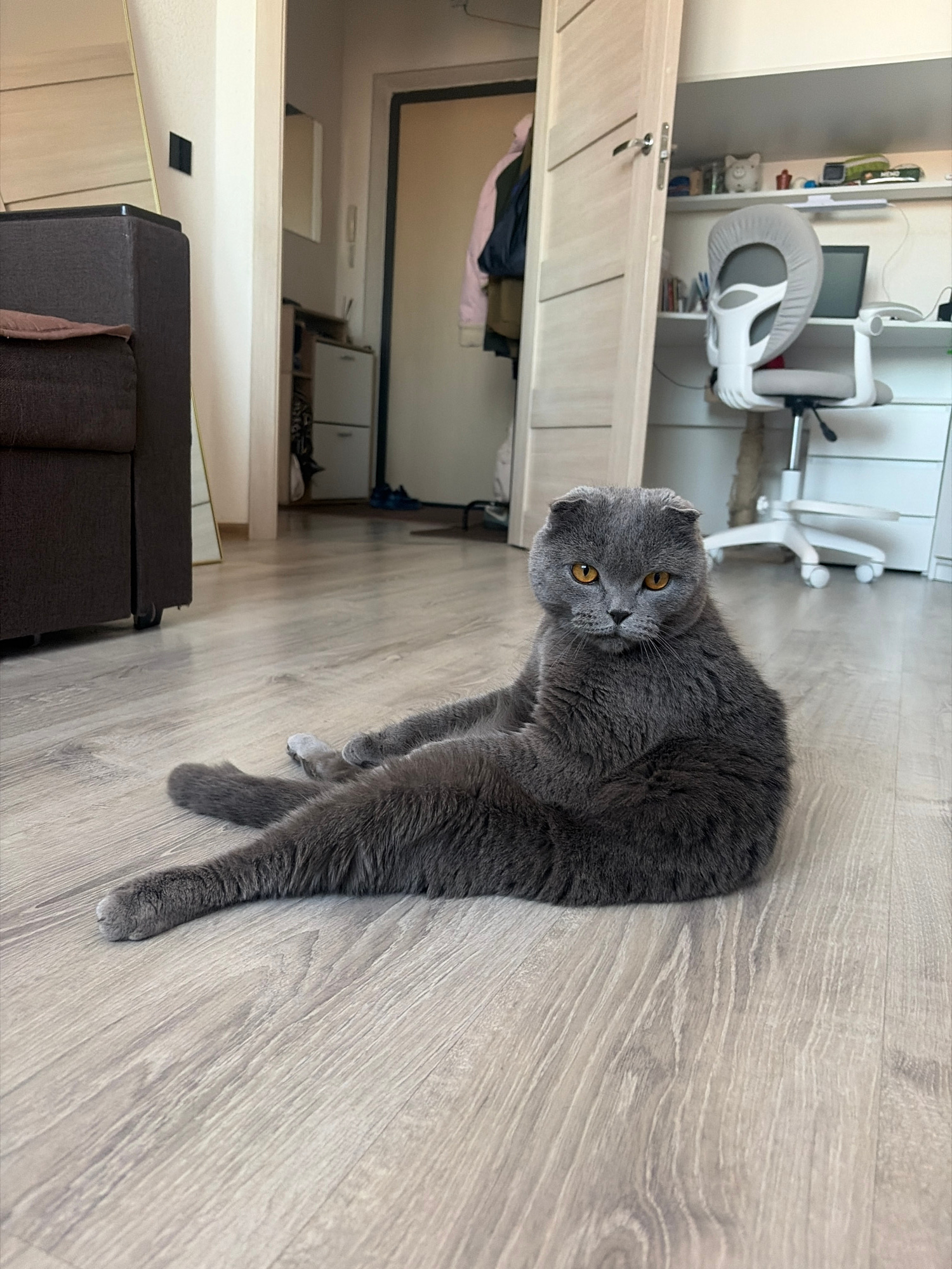 A gray Scottish Fold cat with yellow eyes is seated on a light wood-patterned floor, facing the camera. The cat's pose suggests it might be grooming or stretching. The background includes a partially…read more