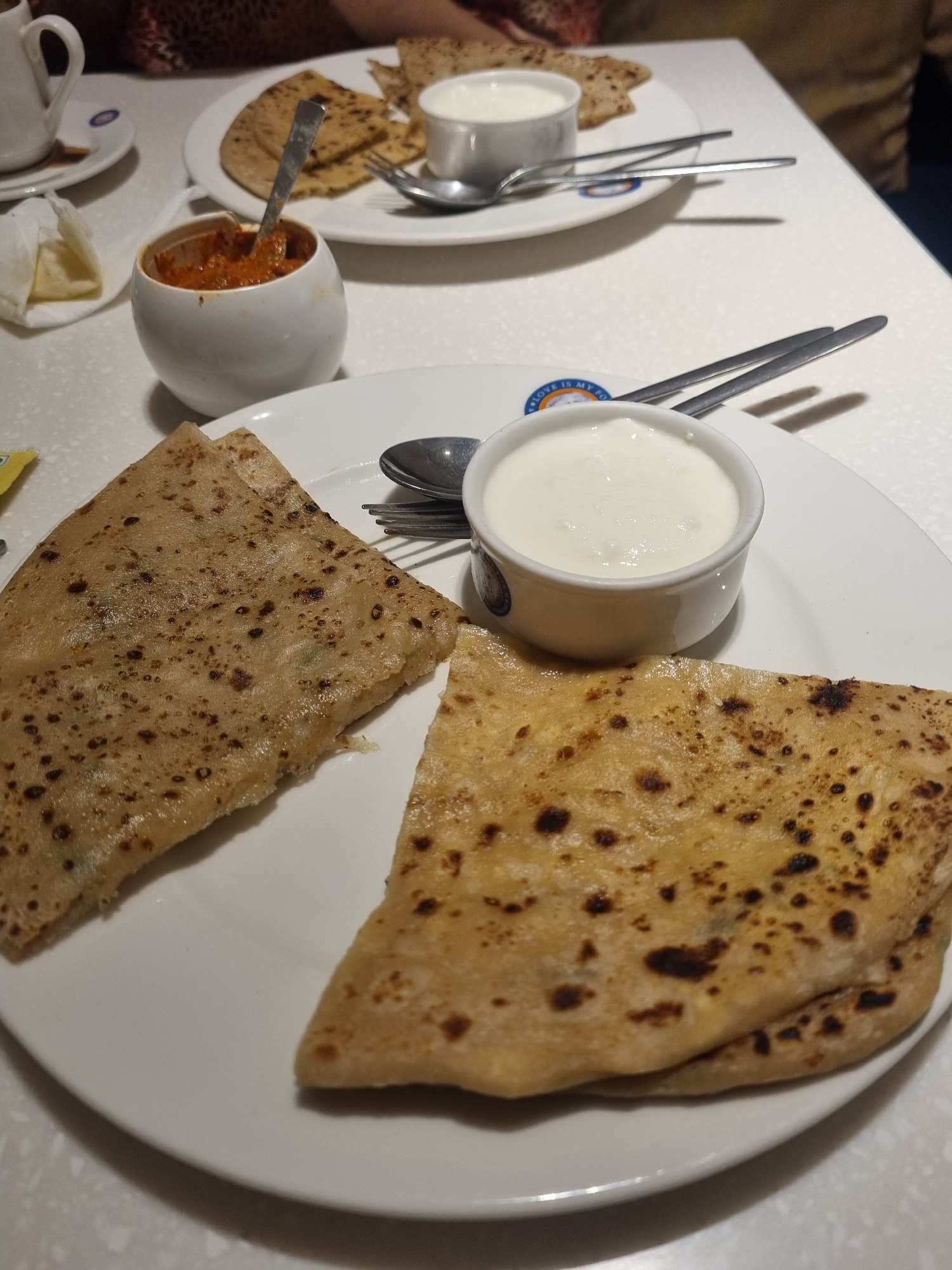 A high-angle shot reveals a table setting, with the primary focus on two white plates. The larger plate contains two pieces of folded, cooked flatbread with darkened spots, and a small, white ceramicβ¦read more
