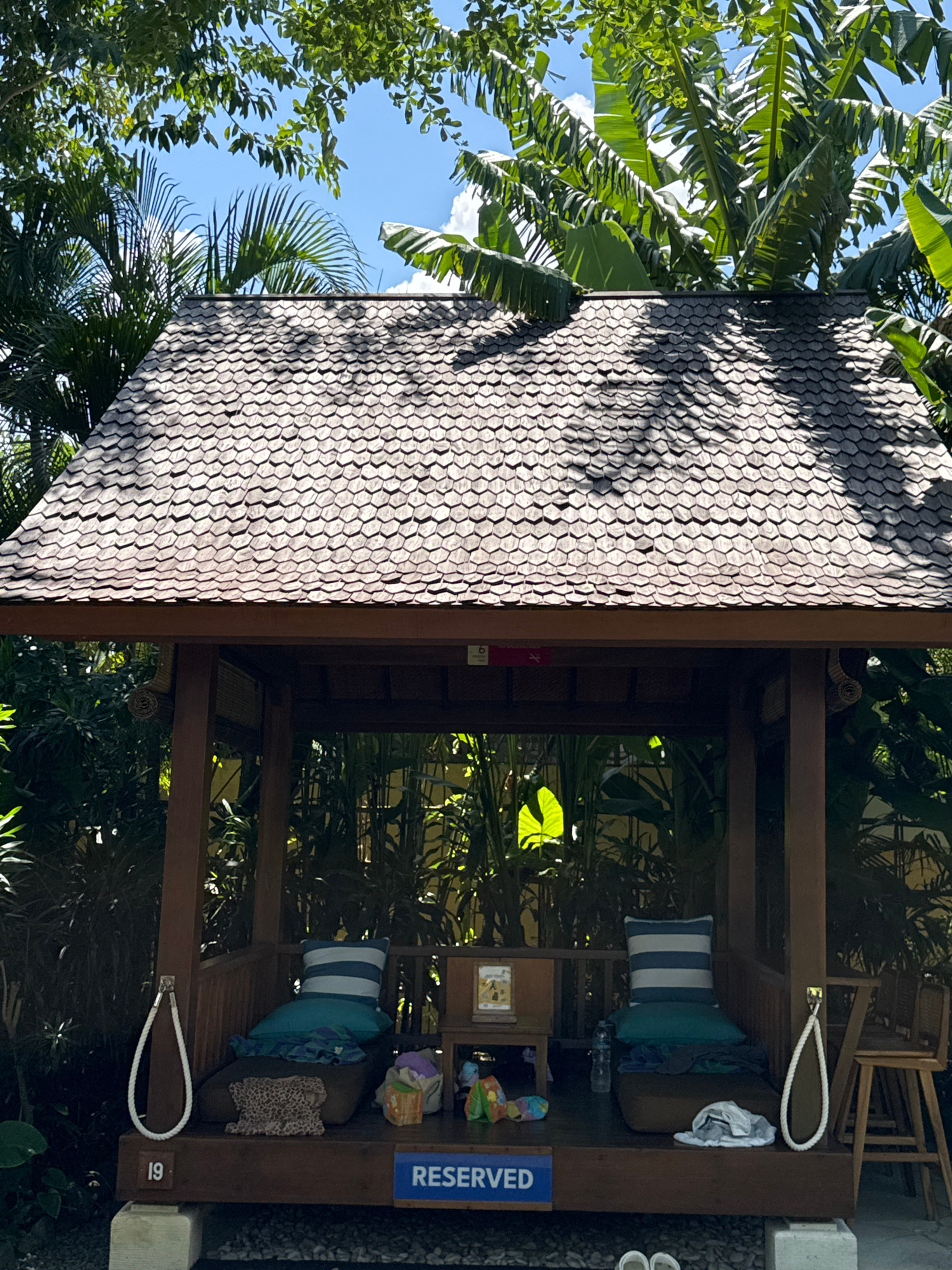 Here's a detailed description of the image: The image captures an outdoor seating area in what appears to be a tropical setting. The focal point is a gazebo or cabana-like structure with a dark, tile…read more