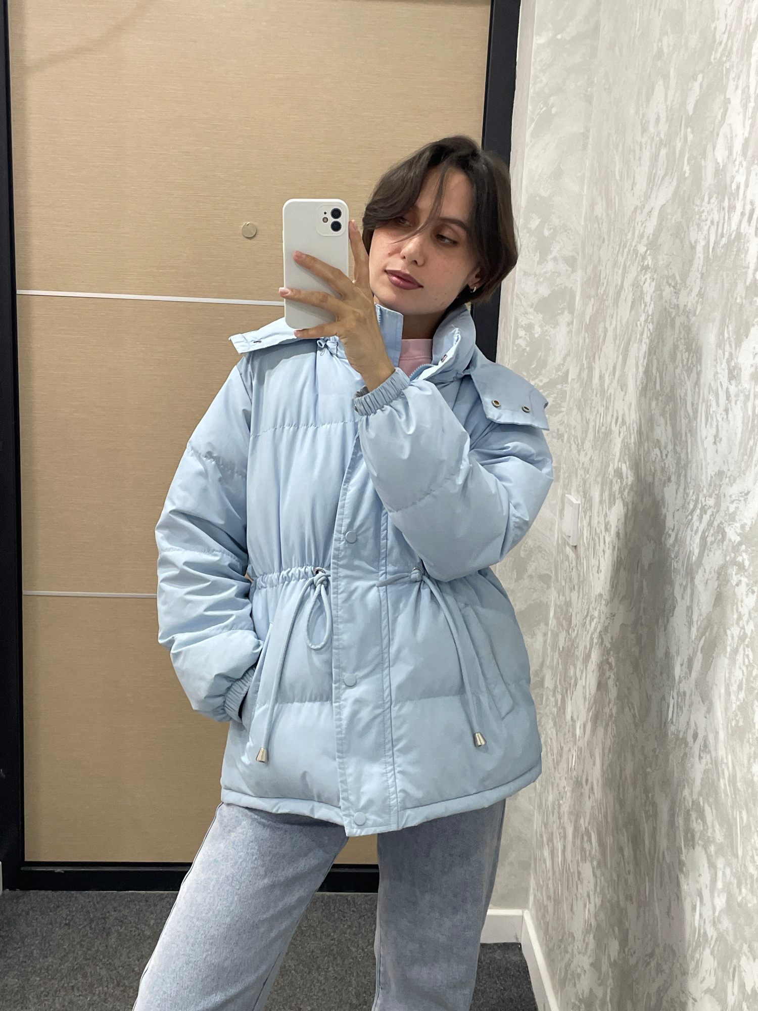 A woman is taking a selfie in a room. She is holding a white smartphone. She is wearing a light blue puffer jacket and gray pants. The room has beige walls and a gray and white patterned ceiling. A bl…read more