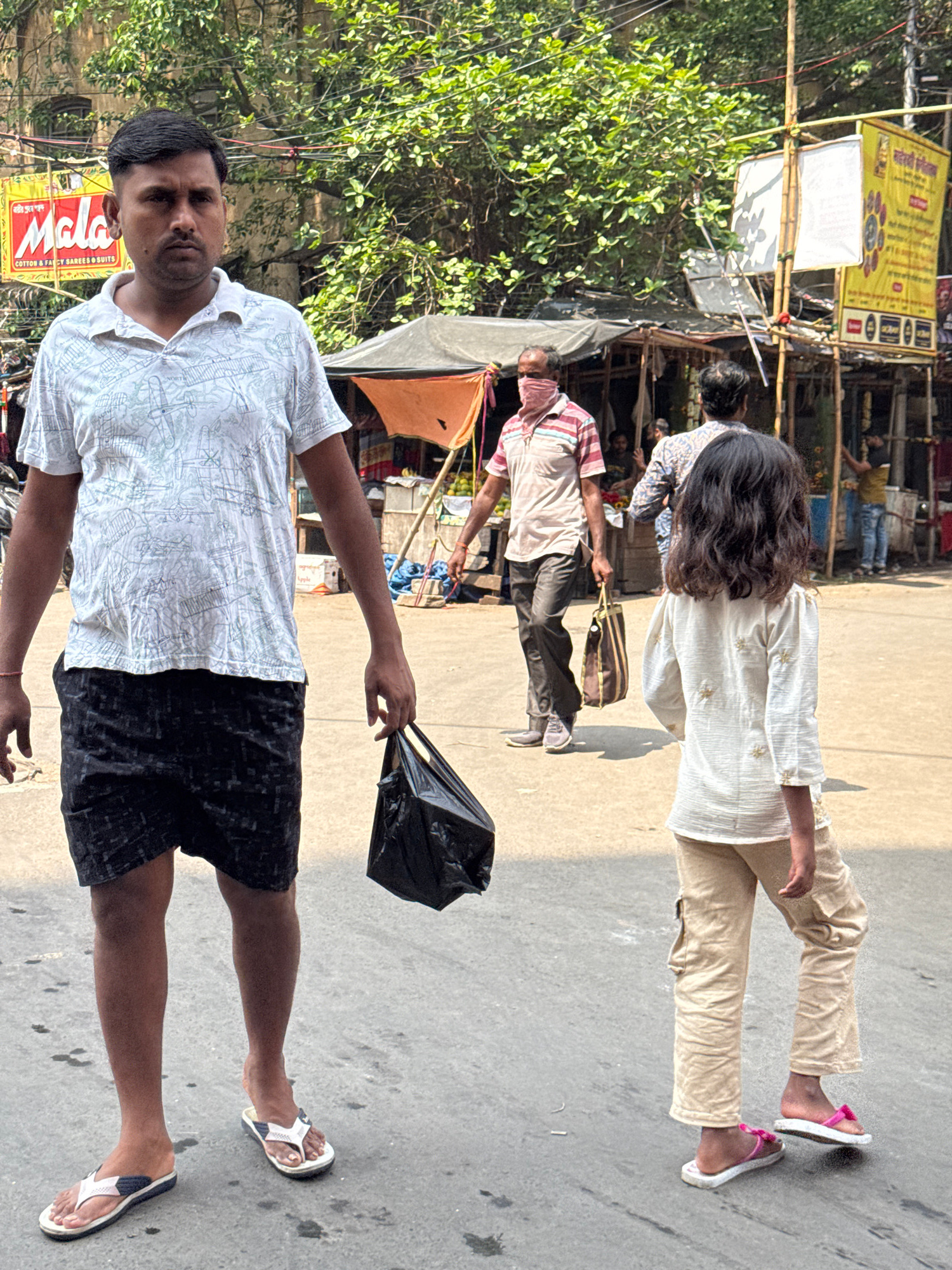 The image depicts a street scene in Kolkata, India. A man wearing a white, patterned short-sleeved shirt and black shorts holds a black plastic bag. He is walking on a paved surface. In the background…read more