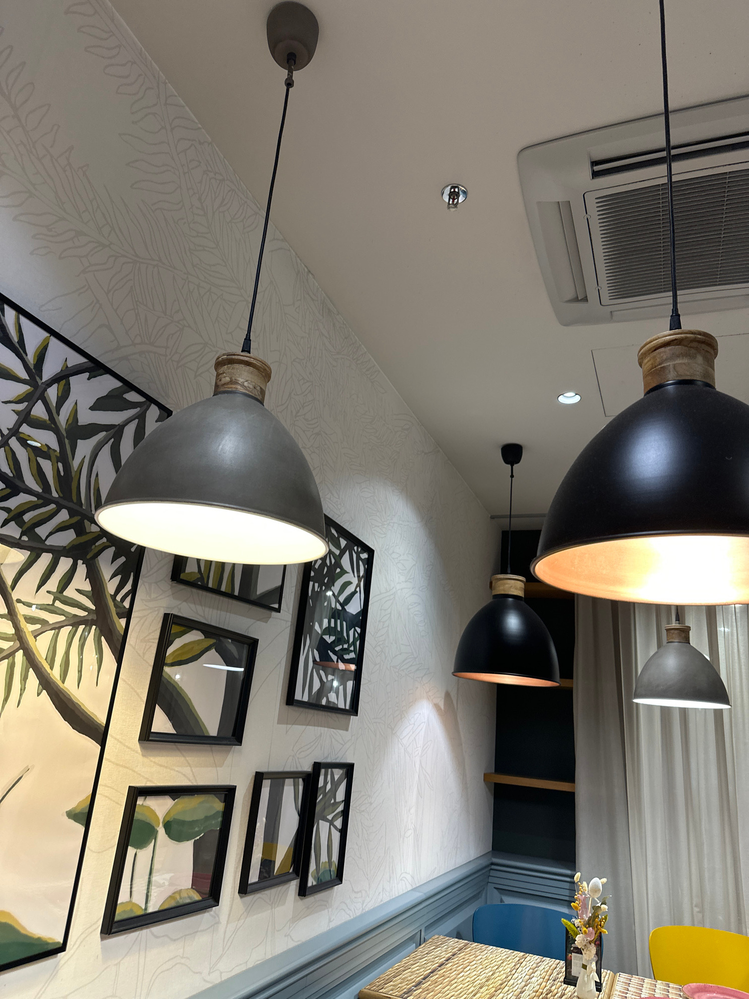 The scene is an interior space with a focus on lighting and wall decor. There are three pendant lamps, two with black shades and one with a gray shade. The lamps are positioned at different heights an…read more