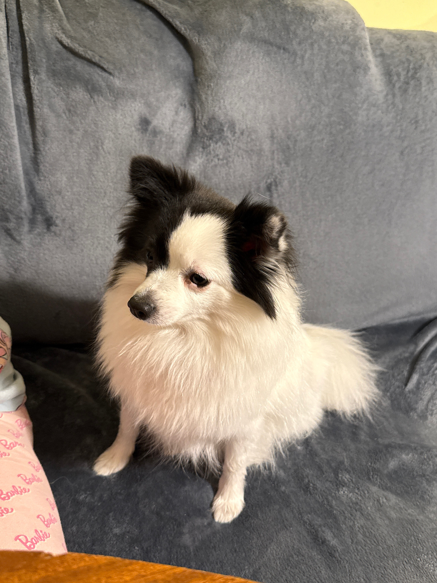 A black and white, long-haired dog is lying on a grey, cushioned surface. The dog is mostly white with black markings on its head and ears. It is looking to the left. A portion of a pink patterned bla…read more