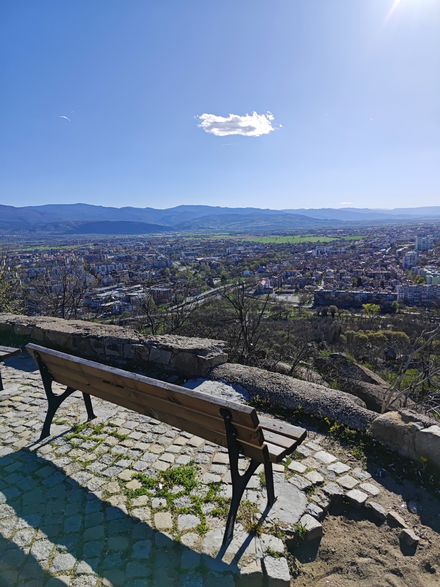 A daytime, long-shot, eye-level photograph captures a scenic view from Nebet Tepe in Plovdiv, Bulgaria. A weathered wooden bench with black metal legs is positioned on a cobblestone pathway in the for…read more