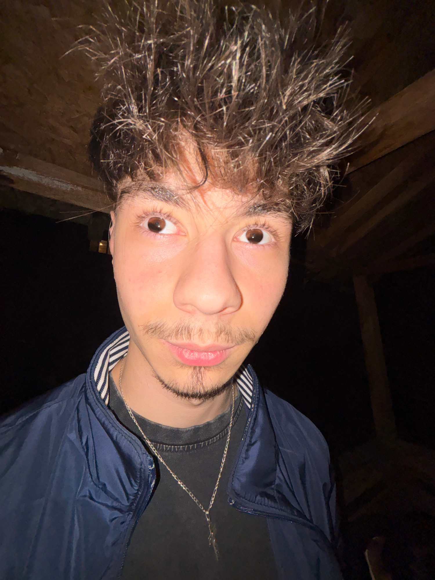 A close-up, tilted self-portrait features a young man with brown hair in a disheveled style. He has fair skin, brown eyes, and a sparse beard. He is wearing a black t-shirt and a blue jacket with a st…read more