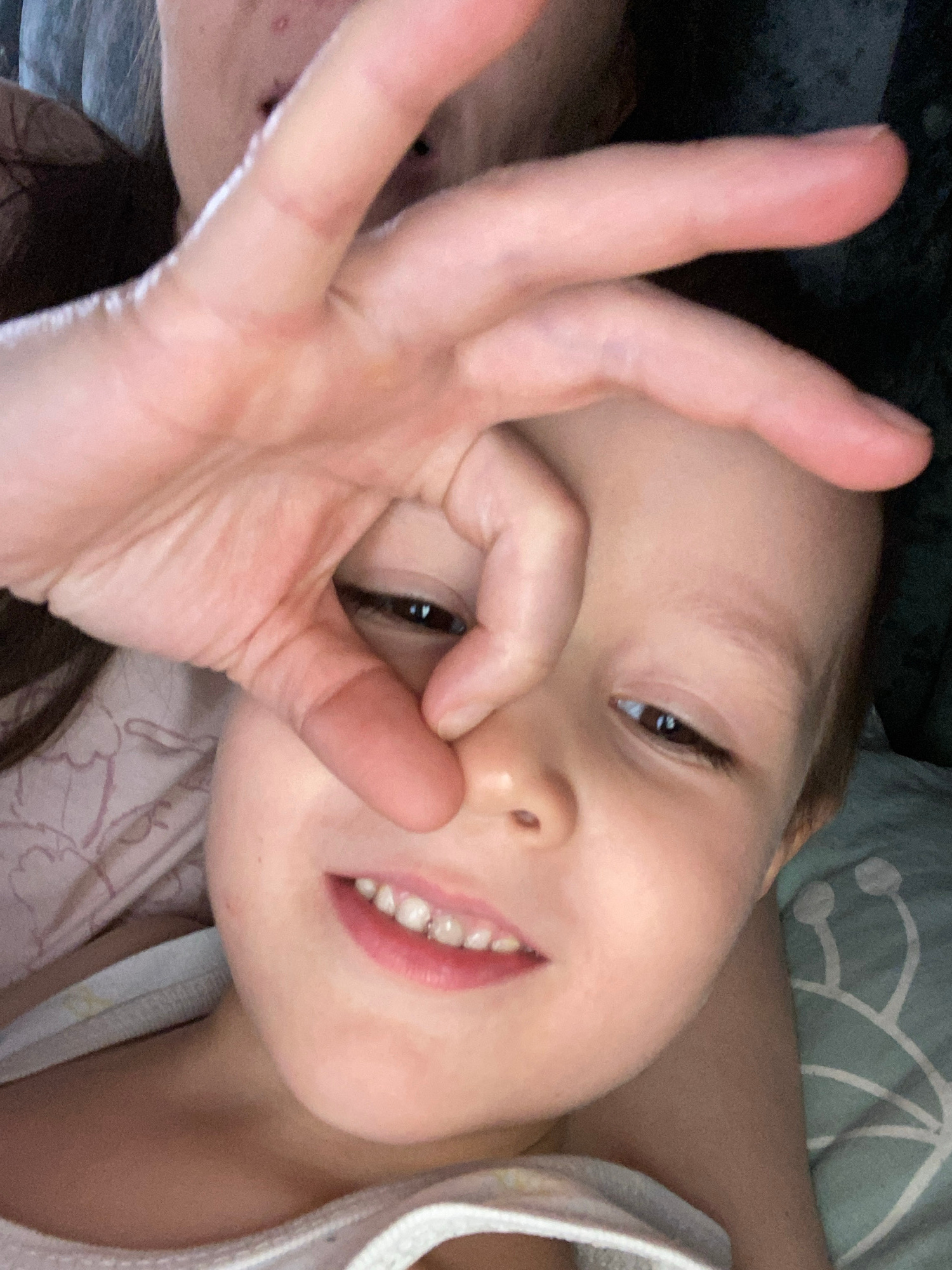 A child is lying down, looking at the camera, and making a circle with their thumb and index finger over their eye. They are smiling and wearing a white tank top. The background shows bedding. There i…read more