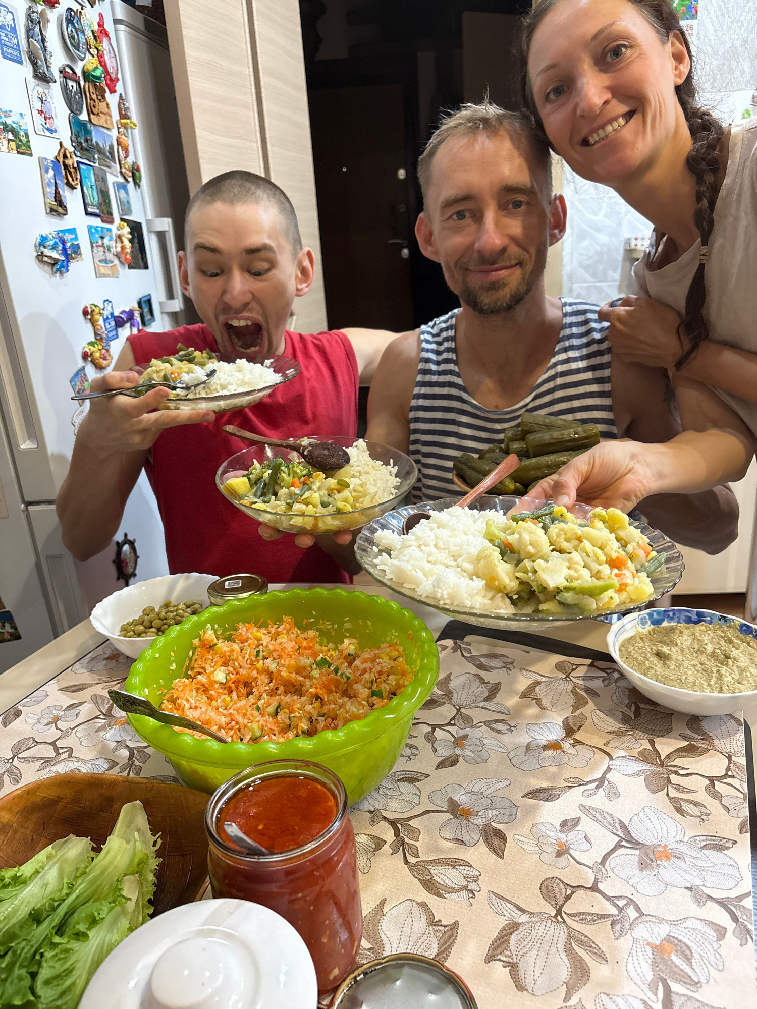 Three people are posing with food. A woman with braided hair, a man in a striped shirt, and another man in a red shirt are holding plates of food. The table is covered with a floral tablecloth and con…read more
