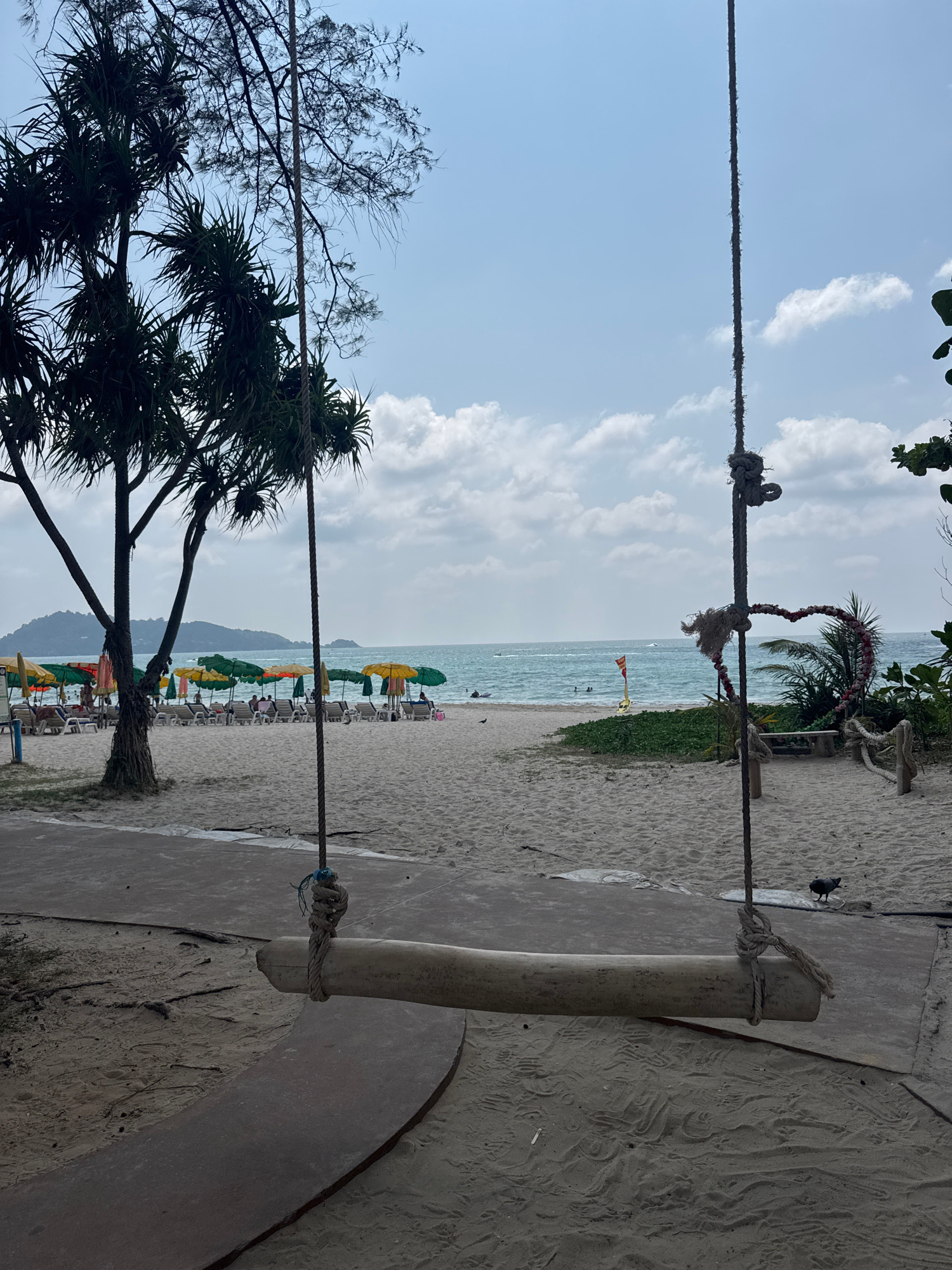 The image depicts a coastal scene, likely a beach, in Patong, Thailand. The composition is framed by a rope swing structure in the foreground, with ropes leading to a horizontal support beam. The beac…read more