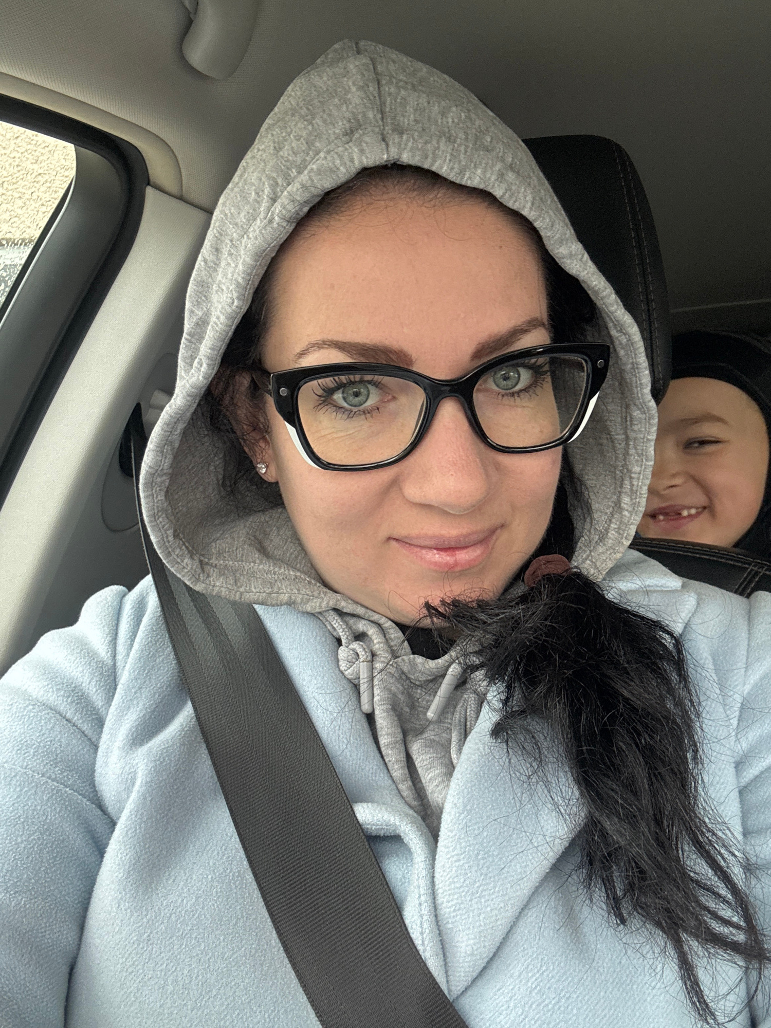 A selfie photograph taken inside a car shows a woman wearing glasses and a gray hooded sweatshirt. The woman has black hair and green eyes. She is wearing a seatbelt. A young child is visible behind h…read more