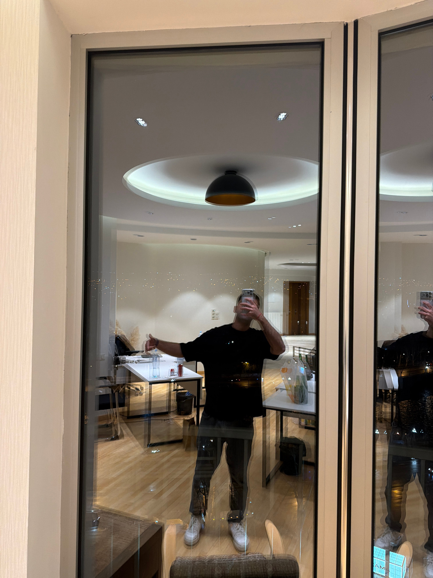A person is reflected in a window, holding a phone and taking a picture. The reflection shows the interior of a room with a modern ceiling light and the exterior showing city lights at night. The loca…read more