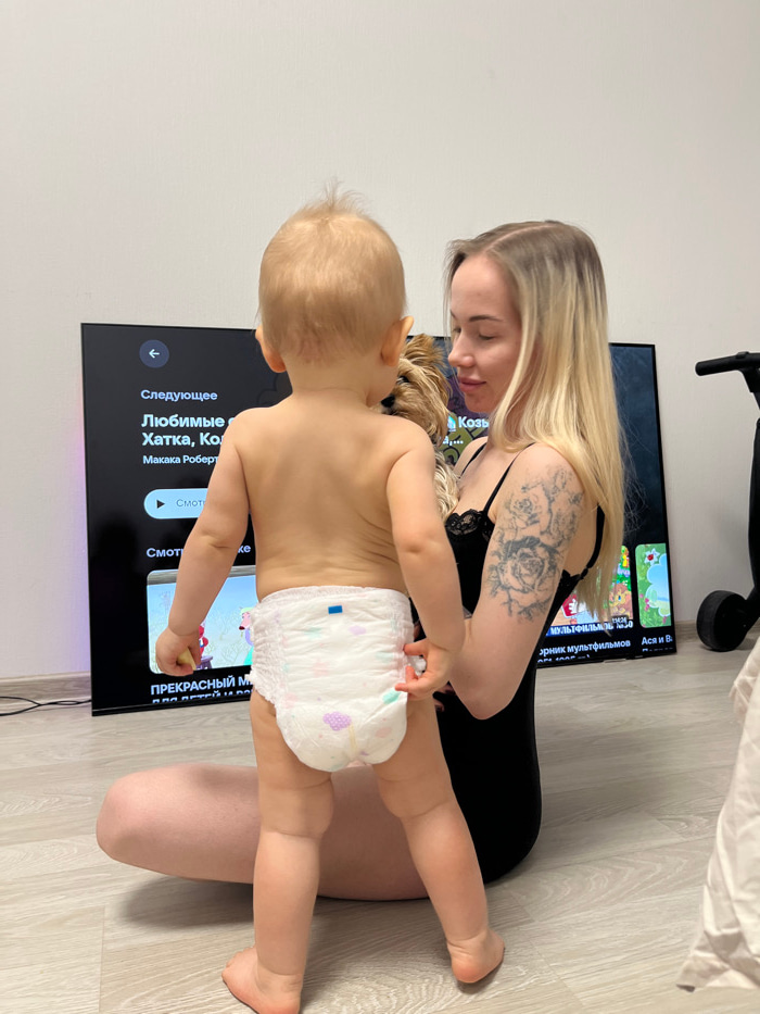 The image captures a candid indoor moment between an adult and a young child, appearing to be taken in a home setting. The photograph is oriented sideways, with the subjects lying on their right sides…read more