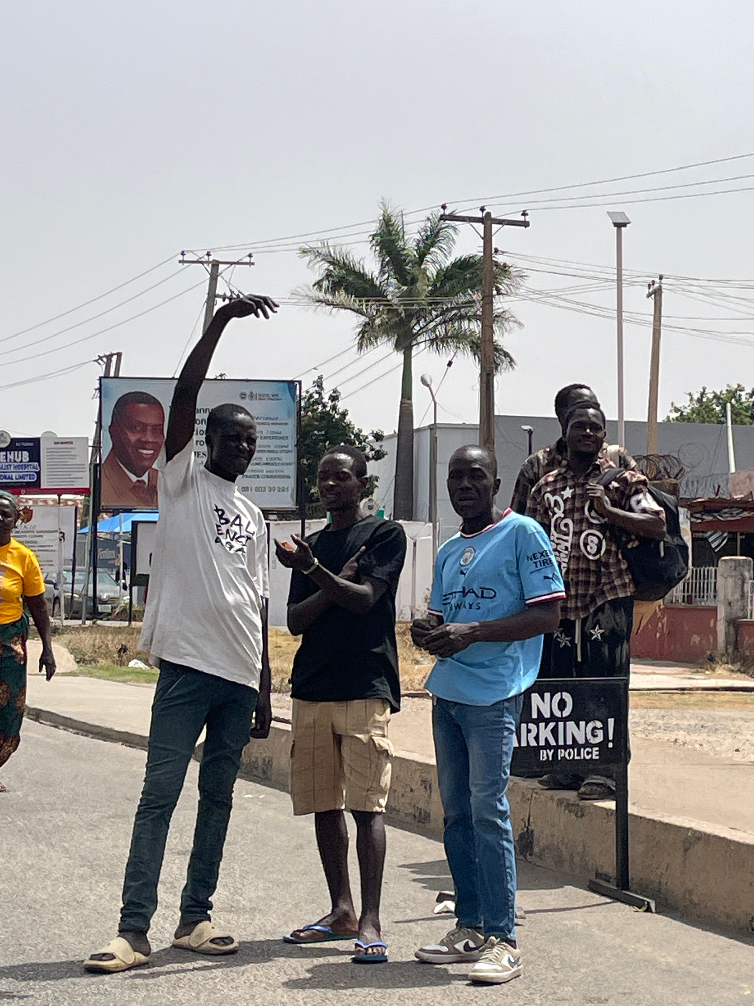 Four men stand together on a sidewalk beside a road, with power lines and a palm tree visible in the background. A "NO PARKING! BY POLICE" sign is next to one of the men. In the background, there is a…read more