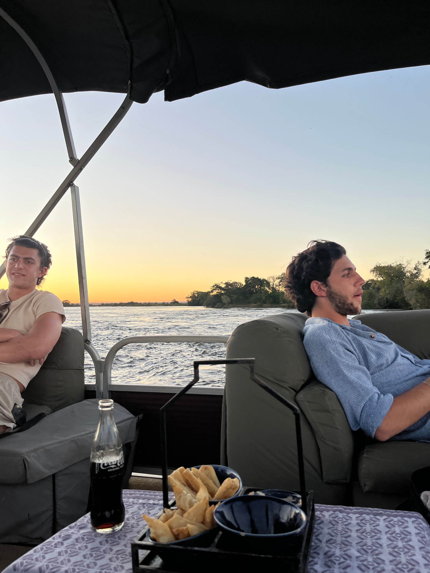 Two men are relaxing on a boat, possibly on the Zambezi River near Victoria Falls, Zimbabwe. The boat has cushioned seats and a canopy. One man is reclining in a chair looking up at the sky, wearing a…read more