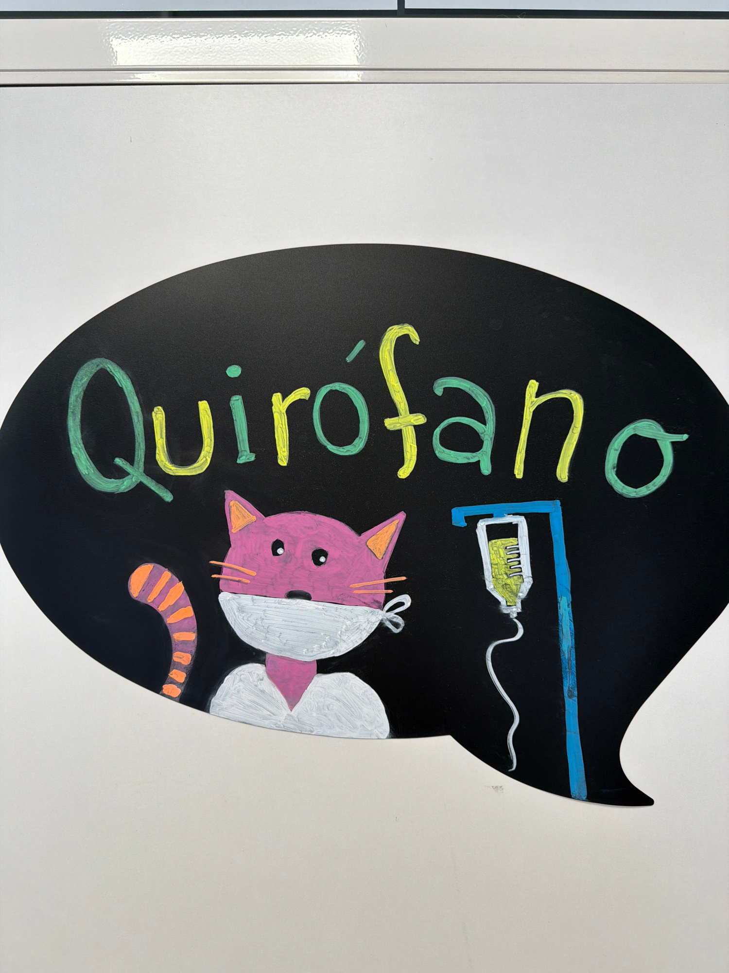 The image depicts a black chalkboard sign mounted on a white wall. The sign is an irregular oval shape with a notched section at the top. On the chalkboard, "Quirófano" is written vertically in yellow…read more