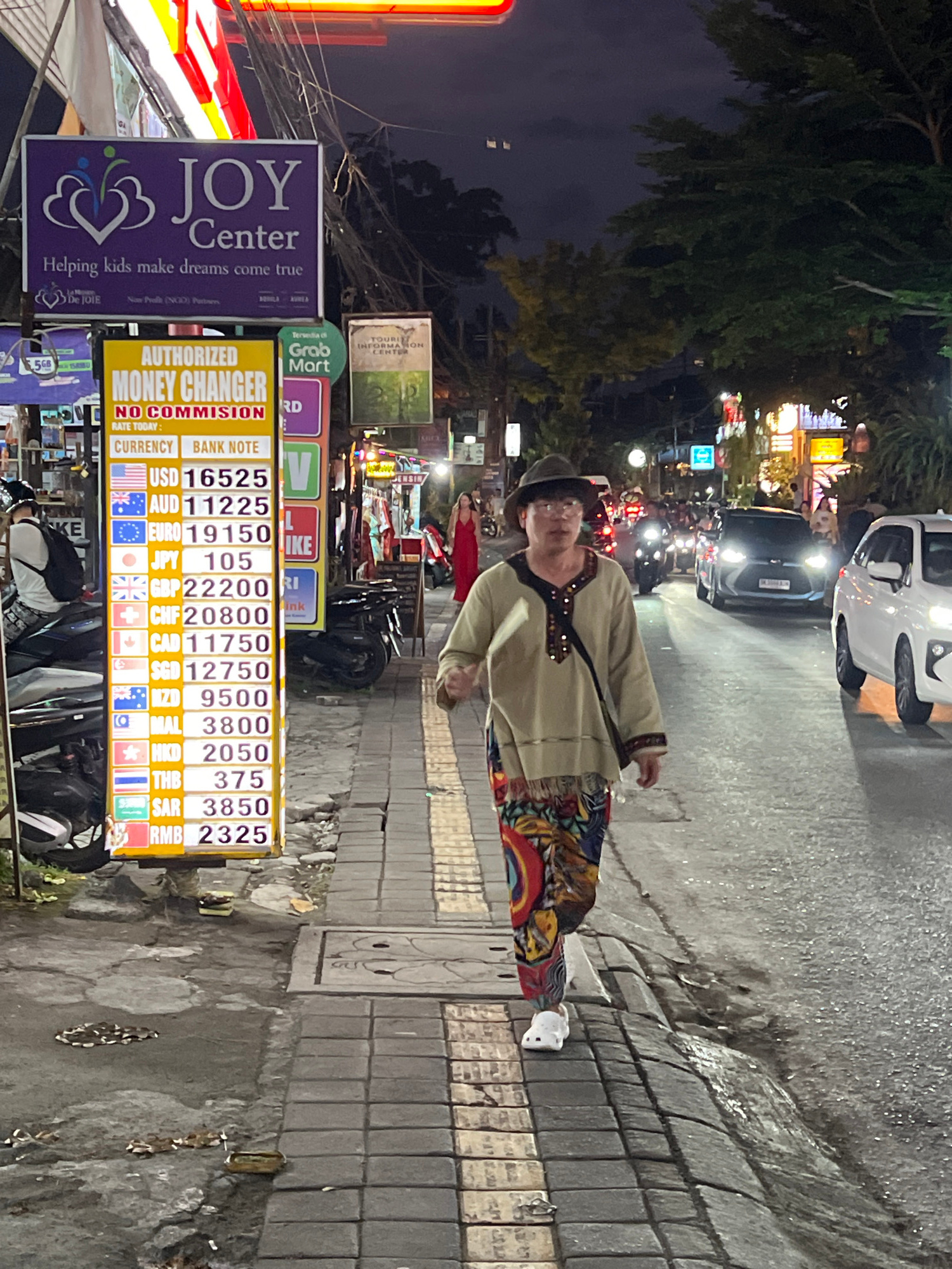 The image captures a street scene in Ubud, Indonesia, at night. A man wearing a tan shirt, colorful pants, and a hat walks on a paved sidewalk, appearing to be in motion. Cars and scooters are visible…read more